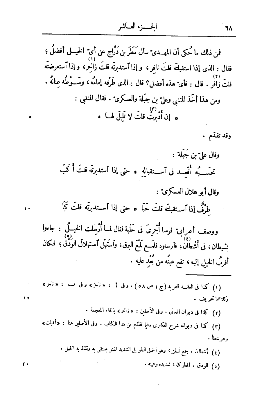 فمن ذلك ما حكى أن المهدىّ سأل مطر بن درّاج عن أىّ الخيل أفضل؛ فقال: الذى إذا استقبلته قلت نافر، وإذا استدبرته قلت زاخر «1» ، وإذا استعرضته قلت زافر «2» . قال: فأىّ هذه أفضل؟ قال: الذى طرفه إمامه، وسوطه عنانه.