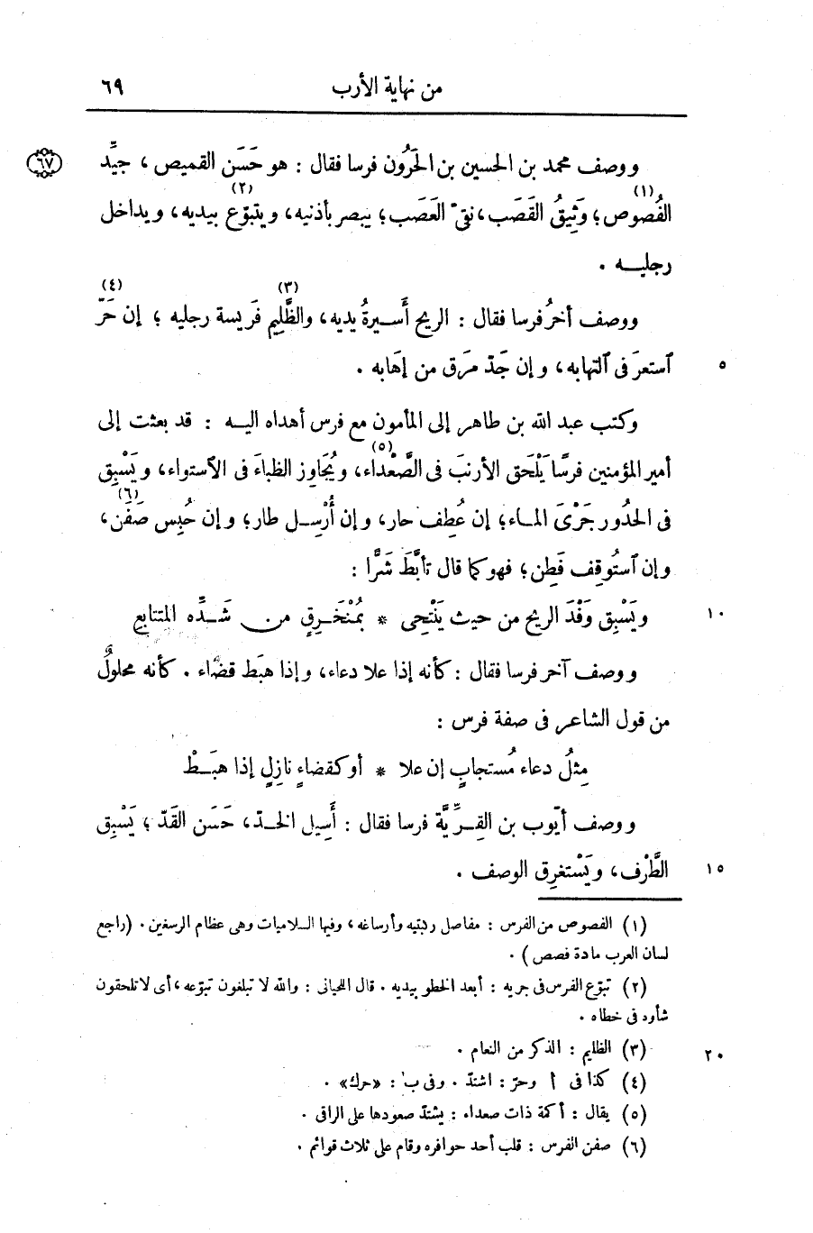 ووصف محمد بن الحسين بن الحرون فرسا فقال: هو حسن القميص، جيّد الفصوص «1» ؛ وثيق القصب، نقىّ العصب؛ يبصر بأذنيه، ويتبوّع «2» بيديه، ويداخل رجليه.