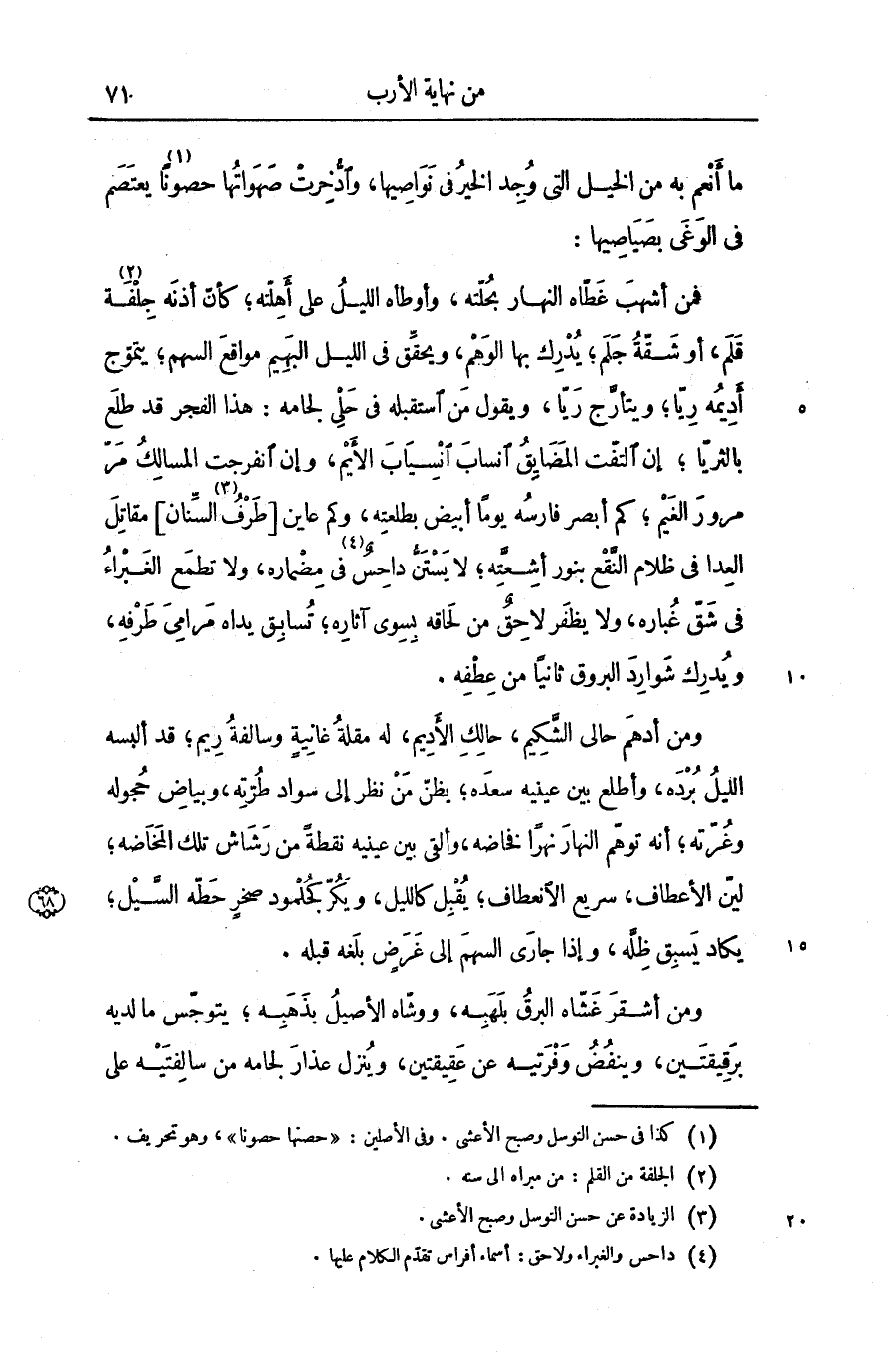 ومن أشقر غشّاه البرق بلهبه، ووشّاه الأصيل بذهبه؛ يتوجّس مالديه برقيقتين، وينفض وفرتيه عن عقيقتين، وينزل عذار لجامه من سالفتيه على