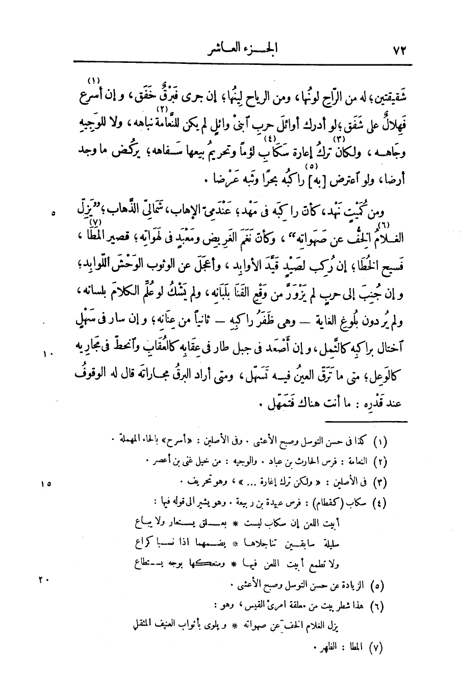ومن كميت نهد، كأنّ راكبه فى مهد؛ عندمىّ الإهاب، شمالىّ الذّهاب؛ «يزلّ الغلام «6» الخفّ عن صهواته» ، وكأنّ نغم الغريض ومعبد فى لهواته؛ قصير المطا «7» ، فسيح الخطا؛ إن ركب لصيد قيّد الأوابد، وأعجل عن الوثوب الوحش اللّوابد؛ وإن جنب إلى حرب لم يزورّ من وقع القنا بلبانه، ولم يشك لو علّم الكلام بلسانه، ولم يردون بلوغ الغاية- وهى ظفر راكبه- ثانيا من عنانه؛ وإن سار فى سهل اختال براكبه كالثّمل، وإن أصعد فى جبل طار فى عقابه كالعقاب وانحطّ فى مجاريه كالوعل؛ متى ما ترقّ العين فيه تسهّل، ومتى أراد البرق مجاراته قال له الوقوف عند قدره: ما أنت هناك فتمهّل.