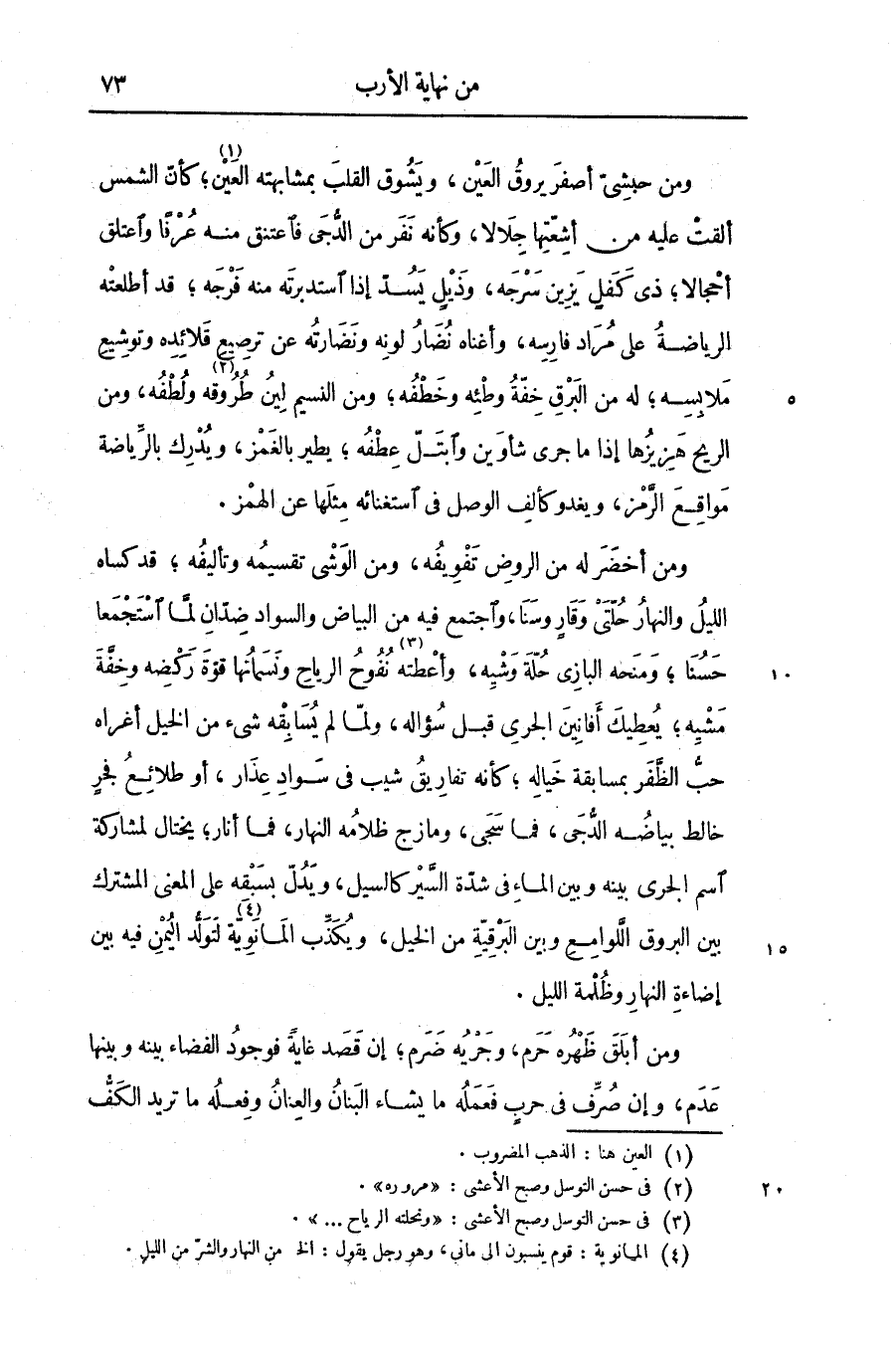 ومن حبشىّ أصفر يروق العين، ويشوق القلب بمشابهته العين «1» ؛ كأنّ الشمس ألقت عليه من أشعّتها جلالا، وكأنه نفر من الدّجى فاعتنق منه عرفا واعتلق أحجالا؛ ذى كفل يزين سرجه، وذيل يسدّ إذا استدبرته منه فرجه؛ قد أطلعته الرياضة على مراد فارسه، وأغناه نضار لونه ونضارته عن ترصيع قلائده وتوشيع ملابسه؛ له من البرق خفّة وطئه وخطفه؛ ومن النسيم لين طروقه «2» ولطفه، ومن الريح هزيزها إذا ما جرى شأوين وابتلّ عطفه؛ يطير بالغمز، ويدرك بالرّياضة مواقع الرّمز، ويغدو كألف الوصل فى استغنائه مثلها عن الهمز.