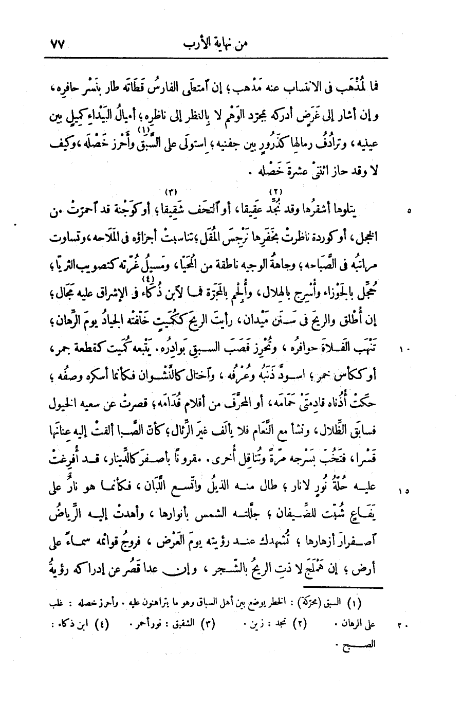 يتلوها أشقرها وقد نجّد «2» عقيقا، أو التحف شقيقا «3» ؛ أو كوجنة قد احمرّت من الخجل، أو كوردة ناظرت بخفرها نرجس المقل؛ تناسبت أجزاؤه فى الملاحه، وتساوت مراتبه فى الصّباحه؛ وجاهة الوجيه ناطقة من المحيّا، ومسيل غرّته كتصويب الثريّا؛ حجّل بالجوزاء وأسرج بالهلال، وألجم بالمجرّة فما لابن ذكاء «4» فى الإشراق عليه مجال؛ إن أطلق والريح فى سنن ميدان، رأيت الريح ككميت خلّفته الجياد يوم الرّهان؛ تنهب الفلاة حوافره، وتحرز قصب السبق بوادره. يتبعه كميت كقطعة جمر، أو ككأس خمر؛ اسودّ ذنبه وعرفه، واختال كالنّشوان فكأنما أسكره وصفه؛ حكت أذناه قادمتى حمامه، أو المحرّف من أقلام قدامه؛ قصرت عن سعيه الخيول فسابق الظّلال، ونشأ مع النّعام فلا يألف غير الرّئال؛ كأنّ الصّبا ألقت إليه عنانها قسرا، فتخبّ بسرجه مرّة وتناقل أخرى. مقرونا بأصفر كالدّينار، قد أفرغت عليه حلّة نور لا نار؛ طال منه الذيل واتّسع اللّبان، فكأنما هو نار على يفاع شبّت للضّيفان؛ جلّلته الشمس بأنوارها، وأهدت إليه الرّياض اصفرار أزهارها؛ تشهدك عند رؤيته يوم العرض، فروج قوائمه سماء على أرض؛ إن هملج لاذت الريح بالشّجر، وإن عدا قصر عن إدراكه رؤية