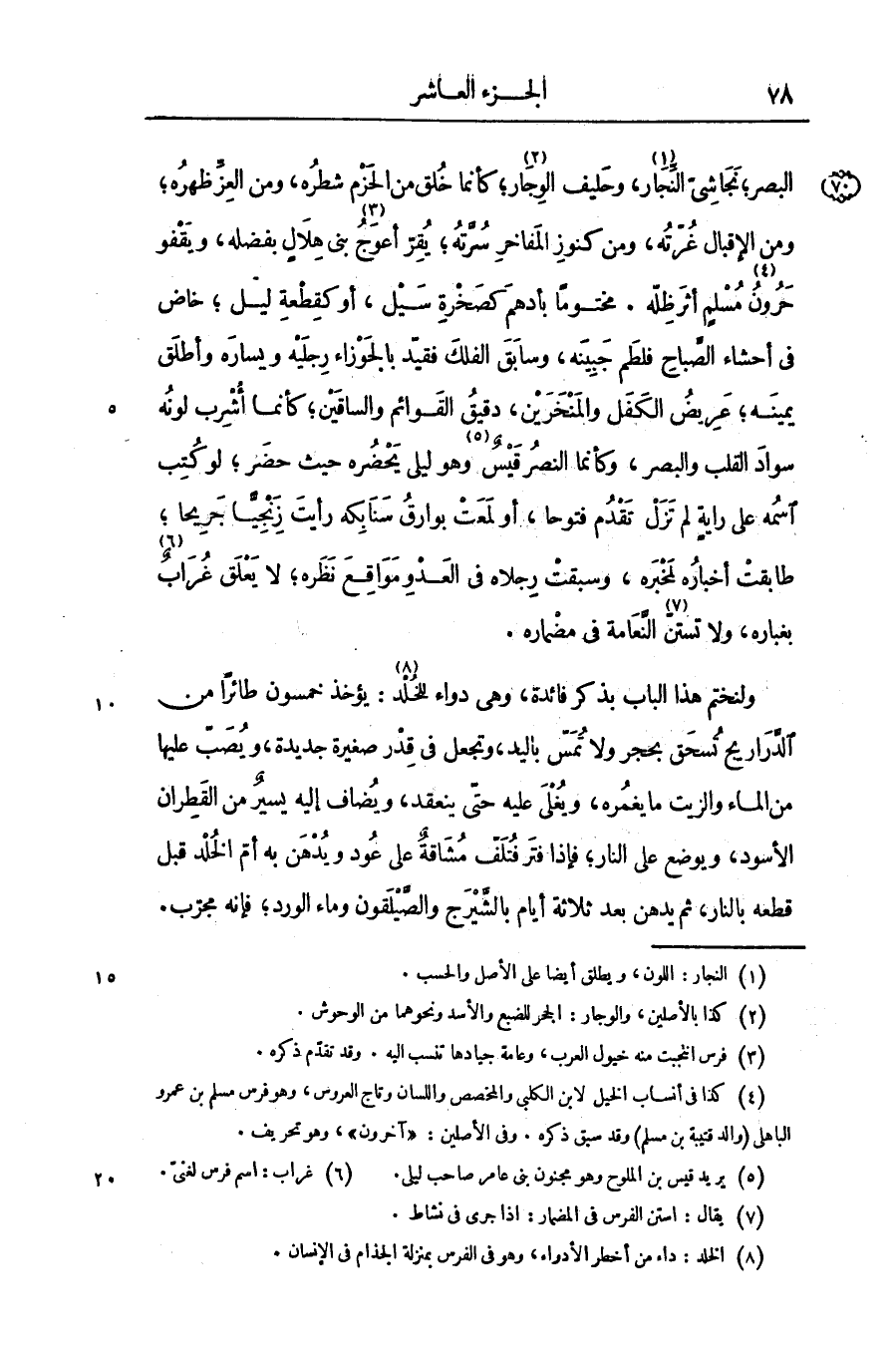 البصر؛ نجاشىّ النّجار «1» ، وحليف الوجار «2» ؛ كأنما خلق من الحزم شطره، ومن العزّ ظهره؛ ومن الإقبال غرّته، ومن كنوز المفاخر سرّته؛ يقرّ أعوج «3» بنى هلال بفضله، ويقفو حرون «4» مسلم أثر ظلّه. مختوما بأدهم كصخرة سيل، أو كقطعة ليل؛ خاض فى أحشاء الصّباح فلطم جبينه، وسابق الفلك فقيّد بالجوزاء رجليه ويساره وأطلق يمينه؛ عريض الكفل والمنخرين، دقيق القوائم والساقين؛ كأنما أشرب لونه سواد القلب والبصر، وكأنما النصر قيس «5» وهو ليلى يحضره حيث حضر؛ لو كتب اسمه على راية لم تزل تقدم فتوحا، أو لمعت بوارق سنابكه رأيت زنجيّا جريحا؛ طابقت أخباره لمخبره، وسبقت رجلاه فى العدو مواقع نظره؛ لا يعلق غراب «6» بغباره، ولا تستنّ «7» النّعامة فى مضماره.