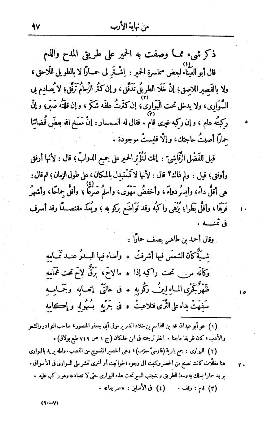 هى أقلّ داء، وأيسر دواء، وأخفض مهوى، وأسلم صرعا «4» ؛ وأقلّ جماحا، وأشهر فرها، وأقلّ بطرا؛ يزهى راكبه وقد تواضع بركوبه؛ ويعدّ مقتصدا وقد أسرف فى ثمنه.