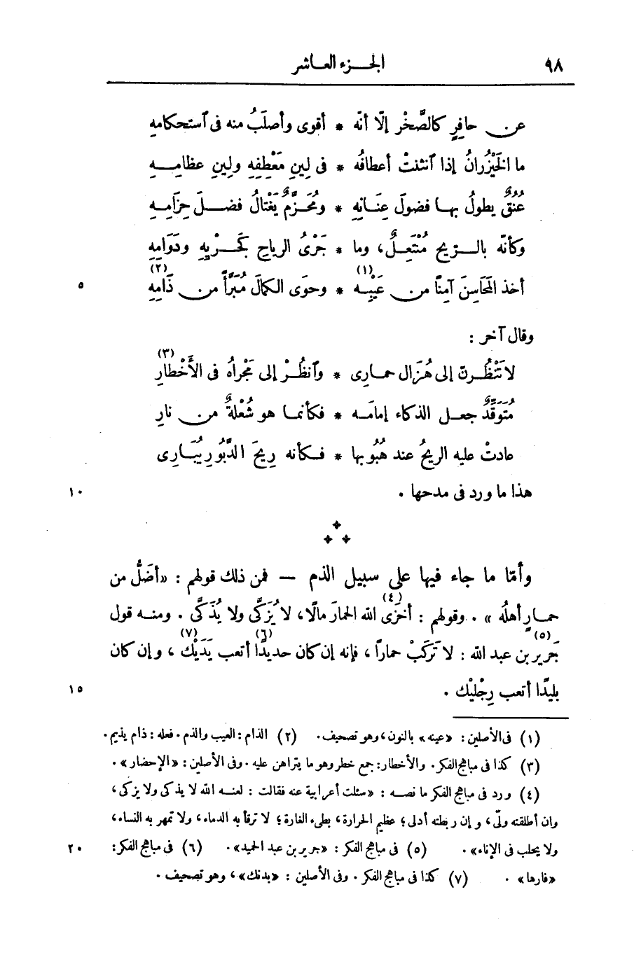 - فمن ذلك قولهم: «أضلّ من حمار أهله» . وقولهم: أخزى «4» الله الحمار مالا، لا يزكّى ولا يذكّى. ومنه قول جرير «5» بن عبد الله: لا تركب حمارا، فإنه إن كان حديدا «6» أتعب يديك، «7» ، وإن كان بليدا أتعب رجليك.