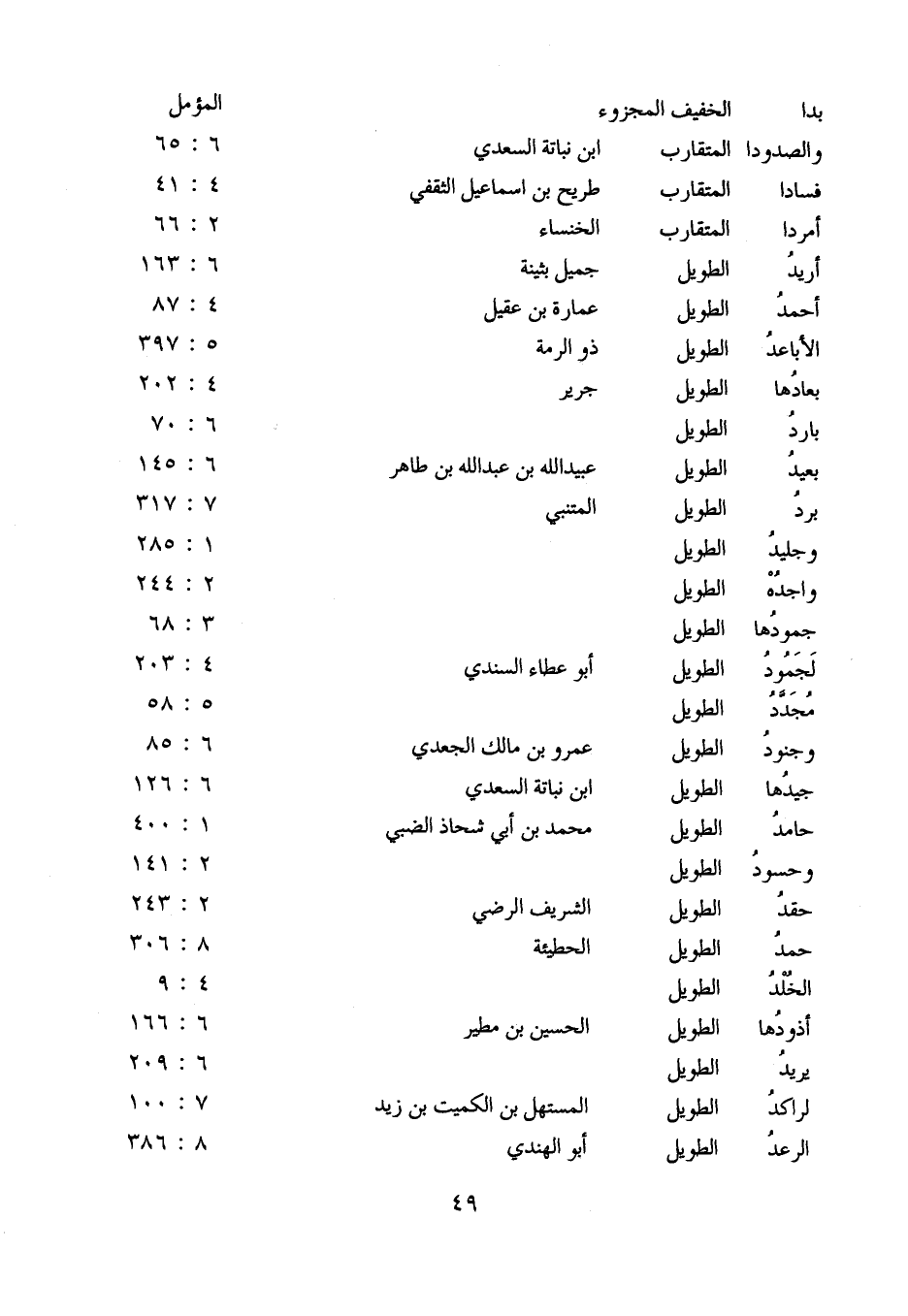 بدا: الخفيف المجزوء:: المؤمل والصدودا: المتقارب: ابن نباتة السعدي: 6: 65