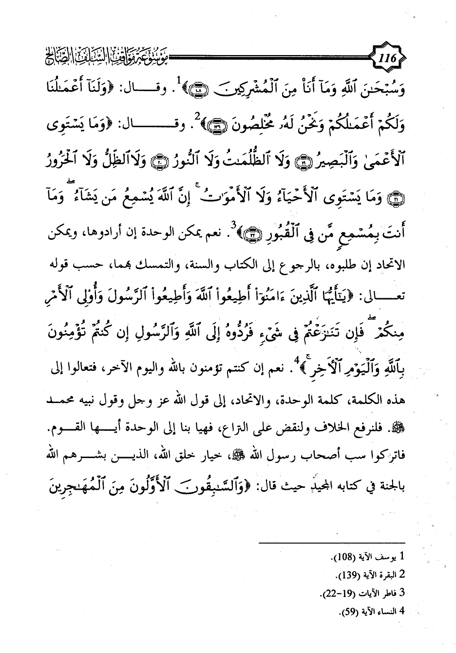نعم يمكن الوحدة إن أرادوها، ويمكن الاتحاد إن طلبوه، بالرجوع إلى الكتاب والسنة، والتمسك بهما، حسب قوله تعالى: {يَا أَيُّهَا الَّذِينَ آَمَنُوا أَطِيعُوا اللَّهَ وَأَطِيعُوا الرَّسُولَ وَأُولِي الْأَمْرِ مِنْكُمْ فَإِنْ تَنَازَعْتُمْ فِي شَيْءٍ فَرُدُّوهُ إِلَى اللَّهِ وَالرَّسُولِ إِنْ كُنْتُمْ تُؤْمِنُونَ بِاللَّهِ وَالْيَوْمِ الْآَخِرِ} (¬4). نعم إن كنتم تؤمنون بالله واليوم الآخر، فتعالوا إلى هذه الكلمة، كلمة الوحدة، والاتحاد، إلى قول الله عز وجل وقول نبيه محمد - صلى الله عليه وسلم -. فلنرفع الخلاف ولنقض على النزاع، فهيا بنا إلى الوحدة أيها القوم. فاتركوا سب أصحاب رسول الله - صلى الله عليه وسلم -، خيار خلق الله، الذين بشرهم الله بالجنة في كتابه المجيد حيث قال: {وَالسَّابِقُونَ الْأَوَّلُونَ مِنَ الْمُهَاجِرِينَ