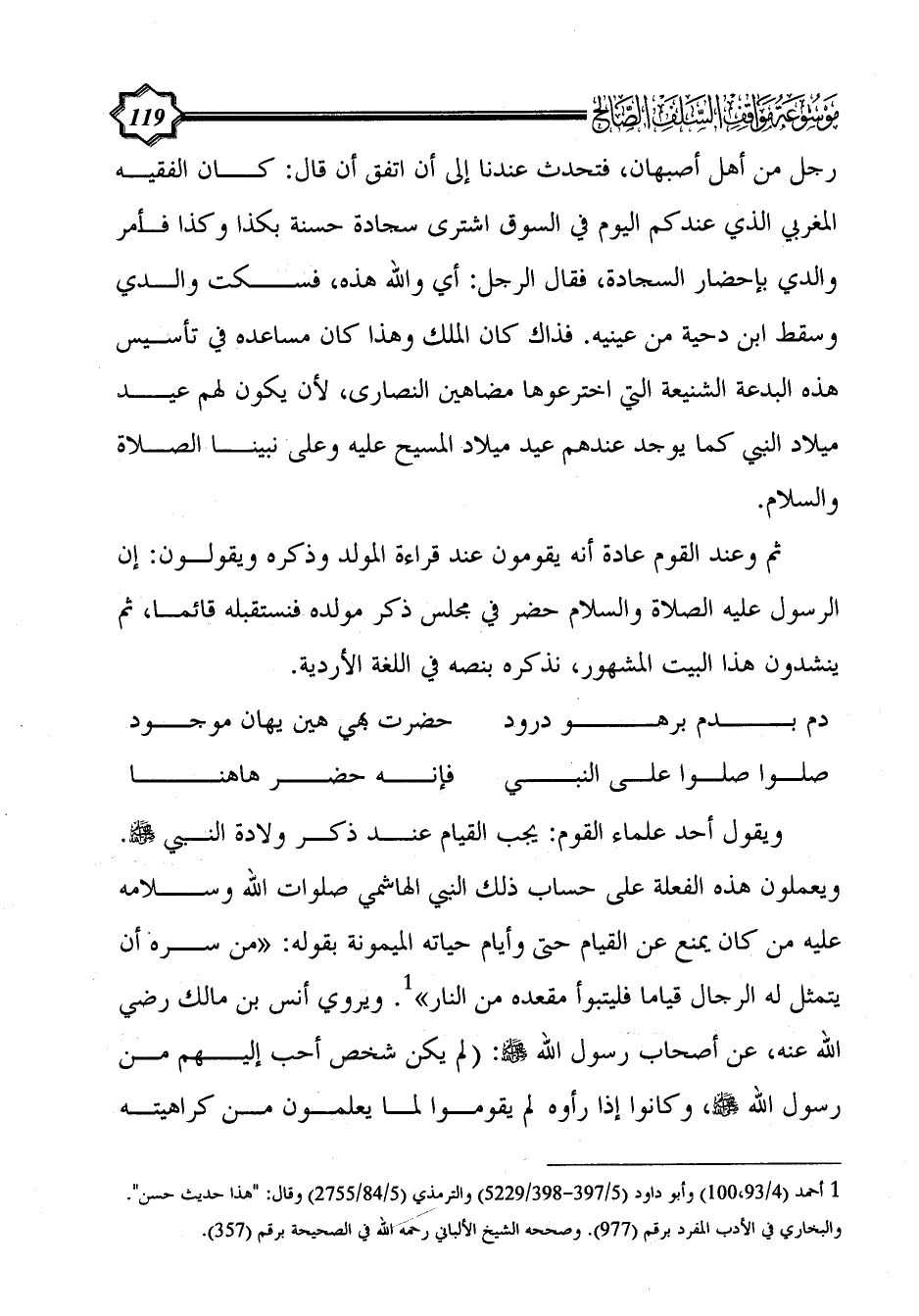 ثم وعند القوم عادة أنه يقومون عند قراءة المولد وذكره ويقولون: إن الرسول عليه الصلاة والسلام حضر في مجلس ذكر مولده فنستقبله قائما، ثم ينشدون هذا البيت المشهور، نذكره بنصه في اللغة الأردية.