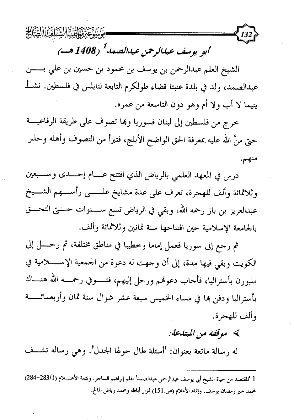 (¬1) 'المقتصد من حياة الشيخ أبي يوسف عبد الرحمن عبد الصمد' بقلم إبراهيم الساجر. وتتمة الأعلام (1/ 283 - 284) لمحمد خير رمضان يوسف. وإتمام الأعلام (ص.151) لنزار أباظه ومحمد رياض المالح.