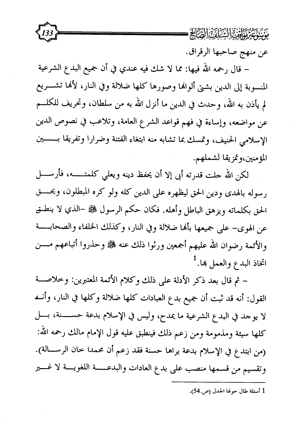 - ثم قال بعد ذكر الأدلة على ذلك وكلام الأئمة المعتبرين: وخلاصة القول: أنه قد ثبت أن جميع بدع العبادات كلها ضلالة وكلها في النار، وأنه لا يوجد في البدع الشرعية ما يمدح، وليس في الإسلام بدعة حسنة، بل كلها سيئة ومذمومة ومن زعم ذلك فينطبق عليه قول الإمام مالك رحمه الله: (من ابتدع في الإسلام بدعة يراها حسنة فقد زعم أن محمدا خان الرسالة). وتقسيم من قسمها منصب على بدع العادات والبدعة اللغوية لا غير