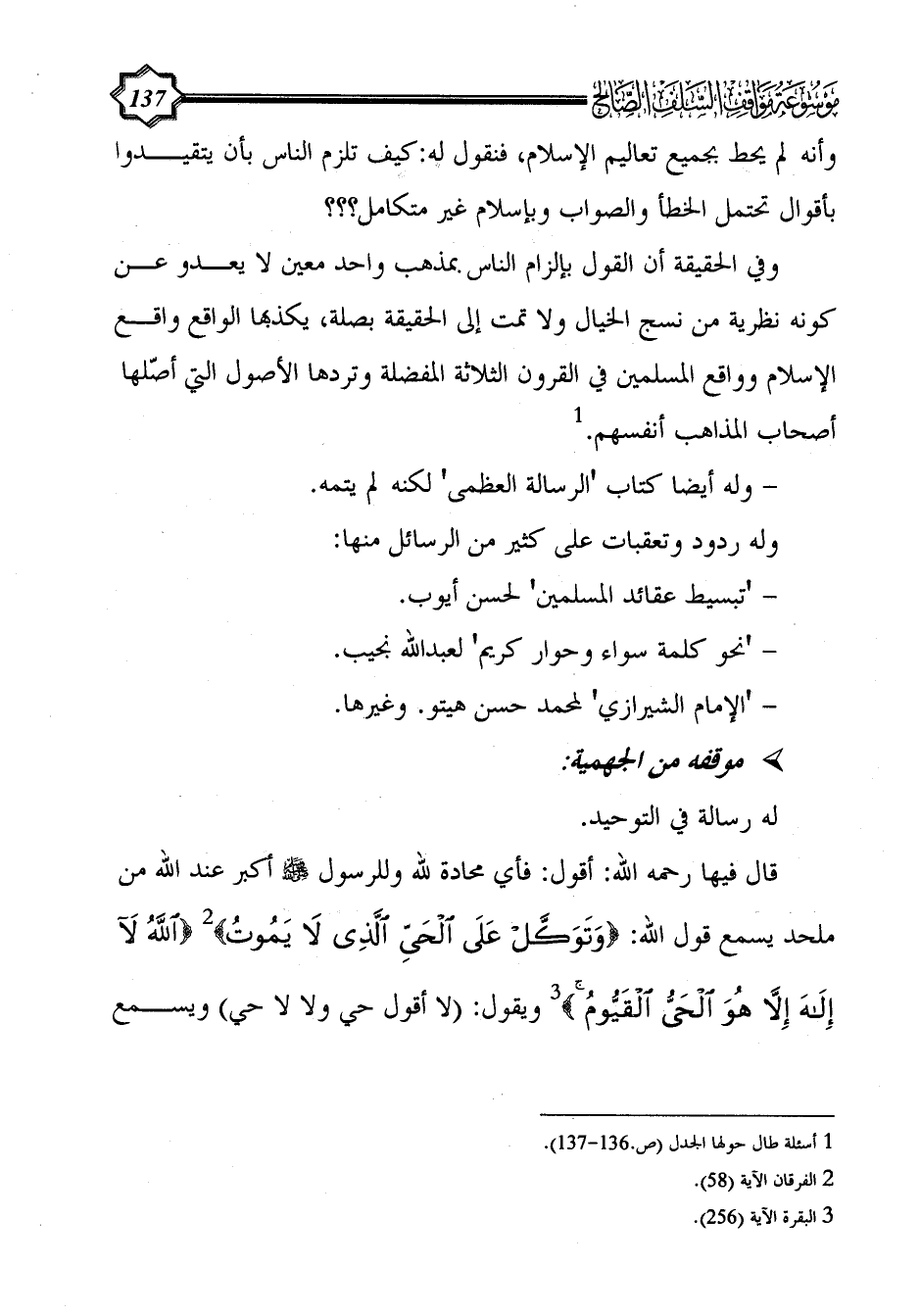 قال فيها رحمه الله: أقول: فأي محادة لله وللرسول - صلى الله عليه وسلم - أكبر عند الله من ملحد يسمع قول الله: {وَتَوَكَّلْ عَلَى الْحَيِّ الَّذِي لَا يَمُوتُ} (¬2) {اللَّهُ لَا إِلَهَ إِلَّا هُوَ الْحَيُّ الْقَيُّومُ} (¬3) ويقول: (لا أقول حي ولا لا حي) ويسمع