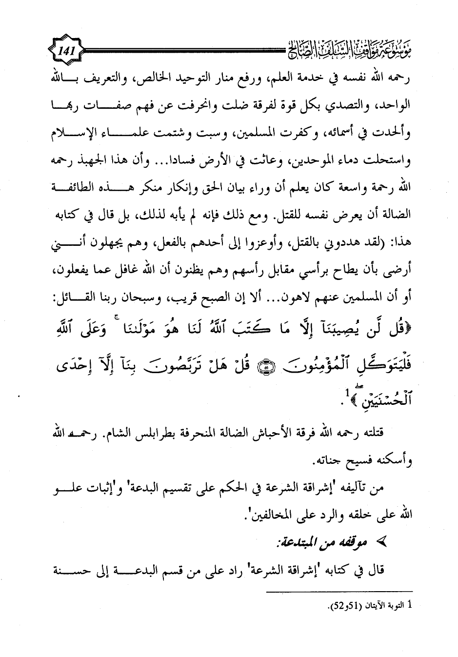 رحمه الله نفسه في خدمة العلم، ورفع منار التوحيد الخالص، والتعريف بالله الواحد، والتصدي بكل قوة لفرقة ضلت وانحرفت عن فهم صفات ربها وألحدت في أسمائه، وكفرت المسلمين، وسبت وشتمت علماء الإسلام واستحلت دماء الموحدين، وعاثت في الأرض فسادا ... وأن هذا الجهبذ رحمه الله رحمة واسعة كان يعلم أن وراء بيان الحق وإنكار منكر هذه الطائفة الضالة أن يعرض نفسه للقتل. ومع ذلك فإنه لم يأبه لذلك، بل قال في كتابه هذا: (لقد هددوني بالقتل، وأوعزوا إلى أحدهم بالفعل، وهم يجهلون أنني أرضى بأن يطاح برأسي مقابل رأسهم وهم يظنون أن الله غافل عما يفعلون، أو أن المسلمين عنهم لاهون ... ألا إن الصبح قريب، وسبحان ربنا القائل: {قُلْ لَنْ يُصِيبَنَا إِلَّا مَا كَتَبَ اللَّهُ لَنَا هُوَ مَوْلَانَا وَعَلَى اللَّهِ فَلْيَتَوَكَّلِ الْمُؤْمِنُونَ (51) قُلْ هَلْ تَرَبَّصُونَ بِنَا إِلَّا إِحْدَى الْحُسْنَيَيْنِ} (¬1).