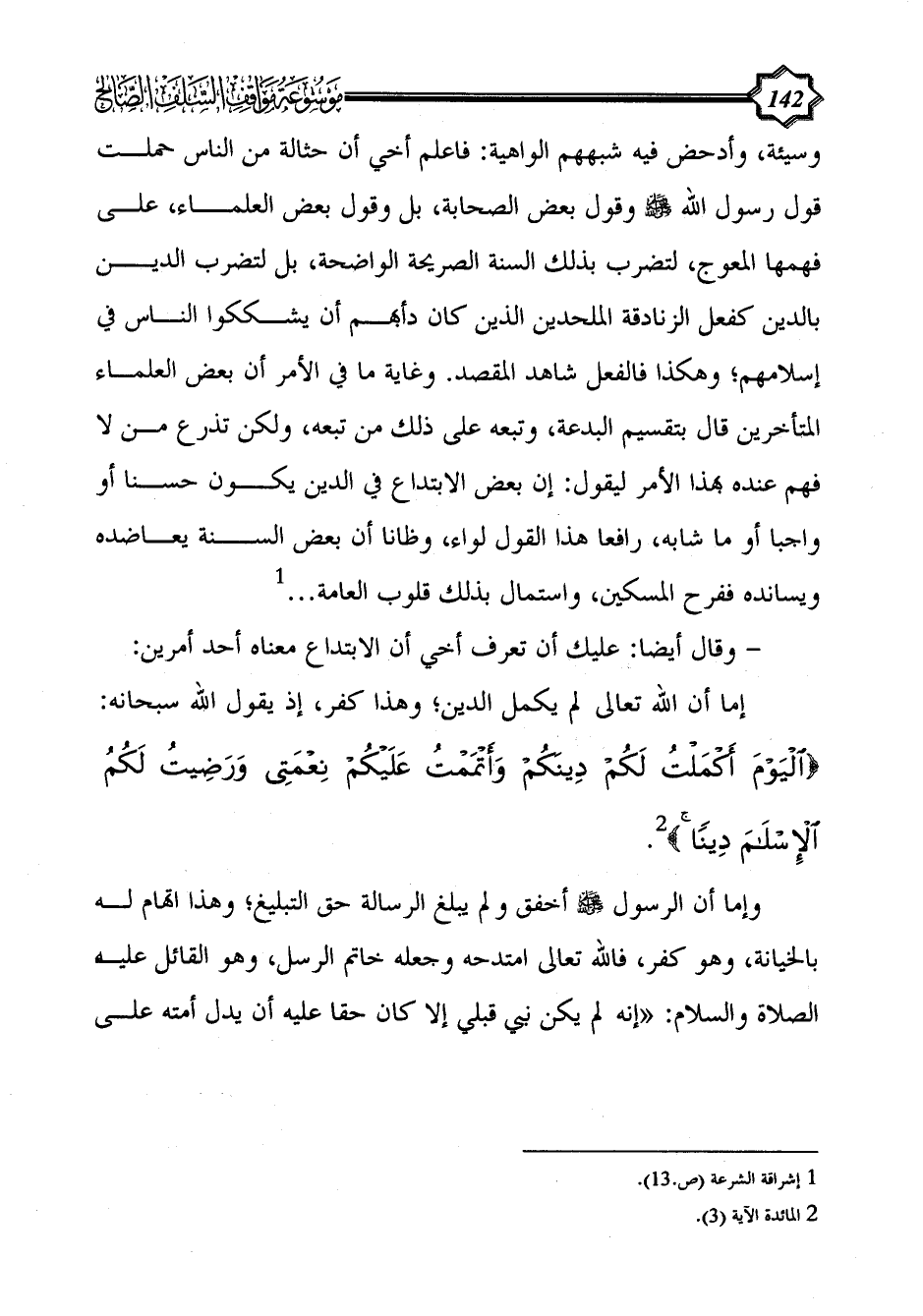 إما أن الله تعالى لم يكمل الدين؛ وهذا كفر، إذ يقول الله سبحانه: {الْيَوْمَ أَكْمَلْتُ لَكُمْ دِينَكُمْ وَأَتْمَمْتُ عَلَيْكُمْ نِعْمَتِي وَرَضِيتُ لَكُمُ الْإِسْلَامَ دِينًا} (¬2).