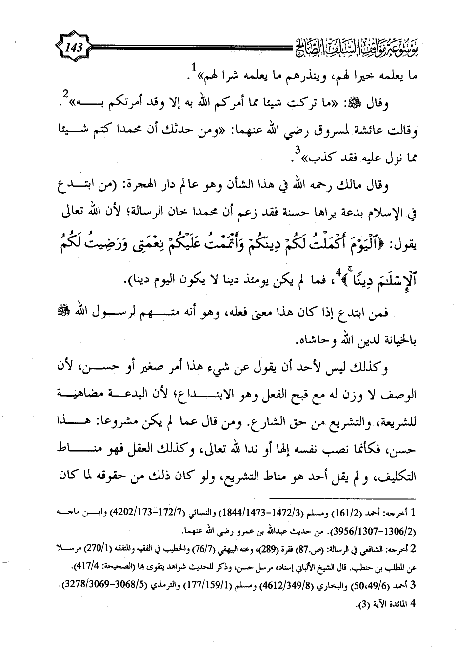 وقال مالك رحمه الله في هذا الشأن وهو عالم دار الهجرة: (من ابتدع في الإسلام بدعة يراها حسنة فقد زعم أن محمدا خان الرسالة؛ لأن الله تعالى يقول: {الْيَوْمَ أَكْمَلْتُ لَكُمْ دِينَكُمْ وَأَتْمَمْتُ عَلَيْكُمْ نِعْمَتِي وَرَضِيتُ لَكُمُ الْإِسْلَامَ دِينًا} (¬4)، فما لم يكن يومئذ دينا لا يكون اليوم دينا).
