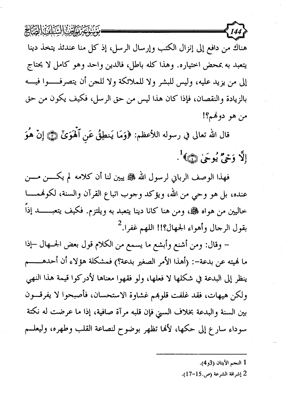 فهذا الوصف الرباني لرسول الله - صلى الله عليه وسلم - يبين لنا أن كلامه لم يكن من عنده، بل هو وحي من الله، ويؤكد وجوب اتباع القرآن والسنة، لكونهما خاليين من هواه - صلى الله عليه وسلم -، ومن هنا كانا دينا يتعبد به ويلتزم. فكيف يتعبد إذاً بقول الرجال وأهواء الجهال؟!! اللهم غفرا. (¬2)