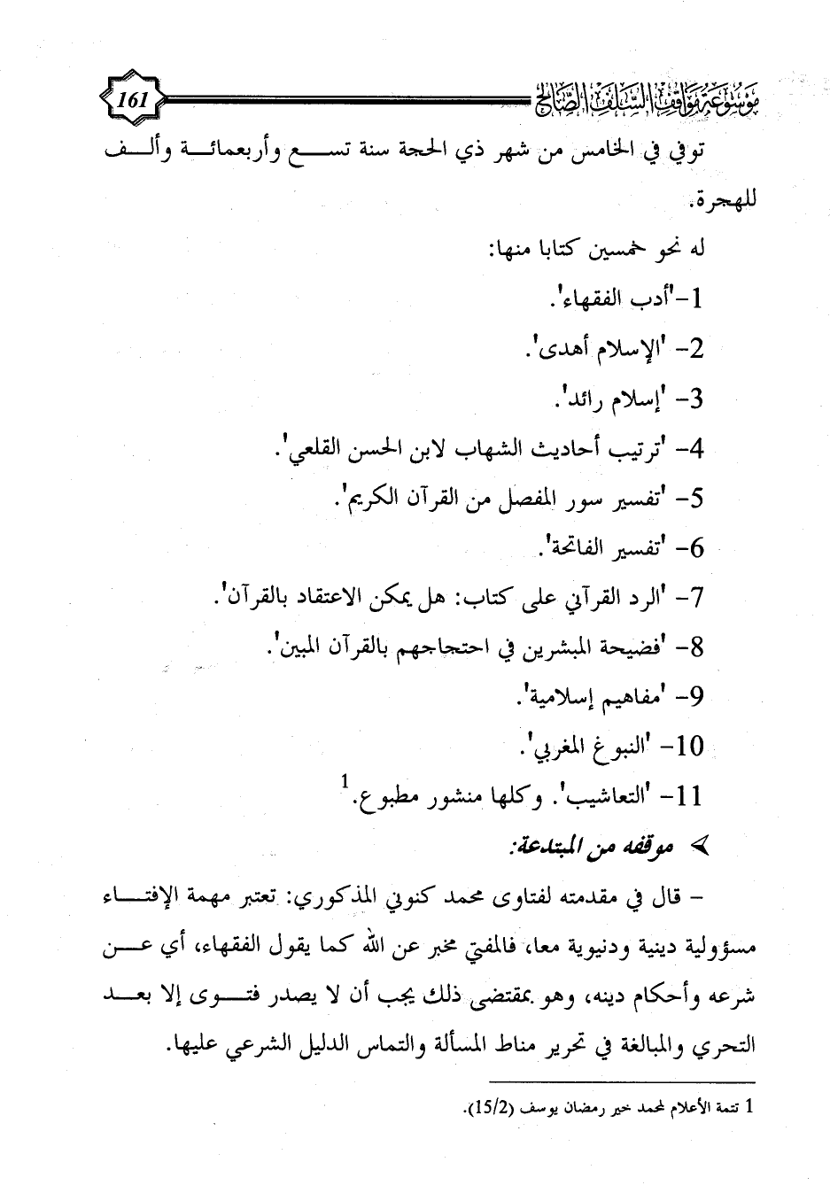 - قال في مقدمته لفتاوى محمد كنوني المذكوري: تعتبر مهمة الإفتاء مسؤولية دينية ودنيوية معا، فالمفتي مخبر عن الله كما يقول الفقهاء، أي عن شرعه وأحكام دينه، وهو بمقتضى ذلك يجب أن لا يصدر فتوى إلا بعد التحري والمبالغة في تحرير مناط المسألة والتماس الدليل الشرعي عليها.