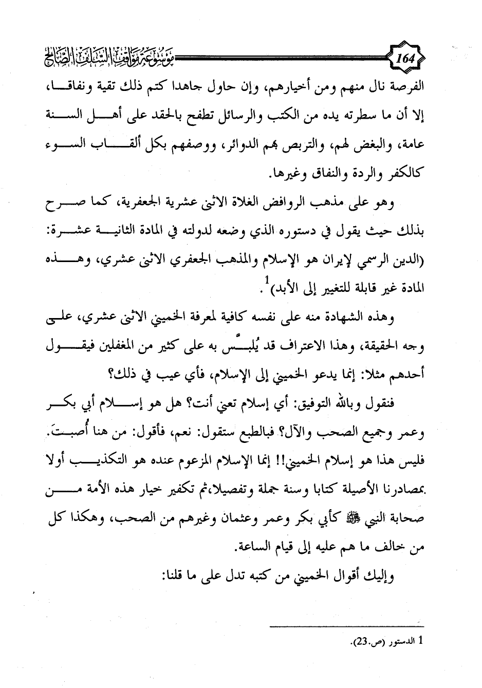 فنقول وبالله التوفيق: أي إسلام تعني أنت؟ هل هو إسلام أبي بكر وعمر وجميع الصحب والآل؟ فبالطبع ستقول: نعم، فأقول: من هنا أُصبتَ. فليس هذا هو إسلام الخميني!! إنما الإسلام المزعوم عنده هو التكذيب أولا بمصادرنا الأصيلة كتابا وسنة جملة وتفصيلا، ثم تكفير خيار هذه الأمة من صحابة النبي - صلى الله عليه وسلم - كأبي بكر وعمر وعثمان وغيرهم من الصحب، وهكذا كل من خالف ما هم عليه إلى قيام الساعة.