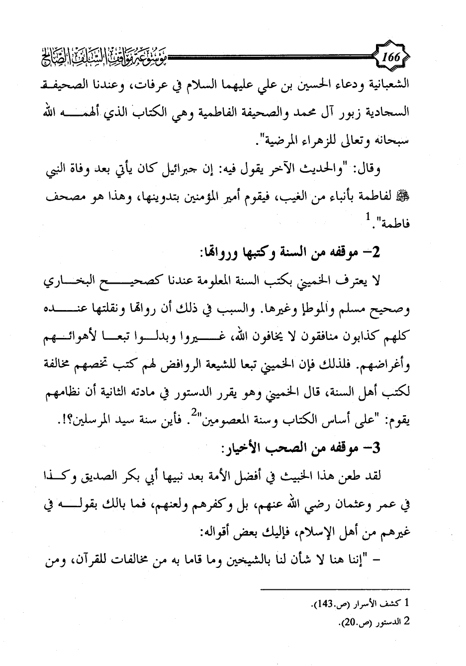 لا يعترف الخميني بكتب السنة المعلومة عندنا كصحيح البخاري وصحيح مسلم والموطإ وغيرها. والسبب في ذلك أن رواتها ونقلتها عنده كلهم كذابون منافقون لا يخافون الله، غيروا وبدلوا تبعا لأهوائهم وأغراضهم. فلذلك فإن الخميني تبعا للشيعة الروافض لهم كتب تخصهم مخالفة لكتب أهل السنة، قال الخميني وهو يقرر الدستور في مادته الثانية أن نظامهم يقوم: "على أساس الكتاب وسنة المعصومين" (¬2). فأين سنة سيد المرسلين؟!.