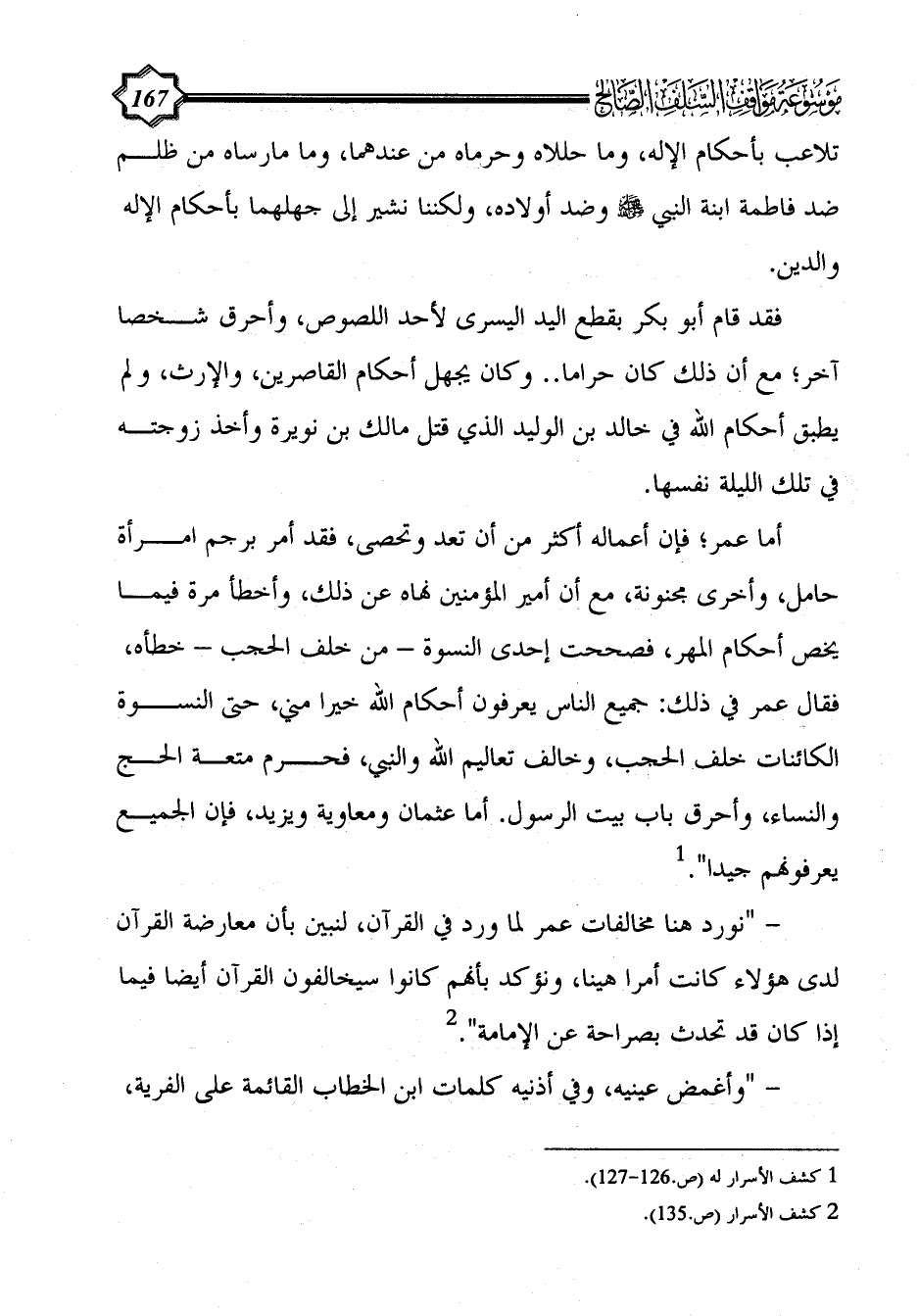 - "نورد هنا مخالفات عمر لما ورد في القرآن، لنبين بأن معارضة القرآن لدى هؤلاء كانت أمرا هينا، ونؤكد بأنهم كانوا سيخالفون القرآن أيضا فيما إذا كان قد تحدث بصراحة عن الإمامة". (¬2)