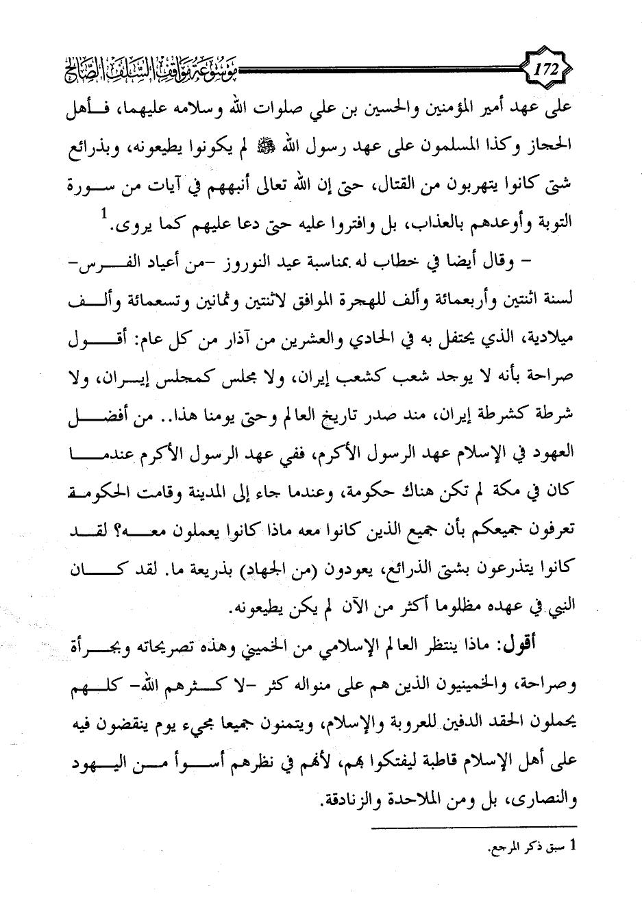 - وقال أيضا في خطاب له بمناسبة عيد النوروز -من أعياد الفرس- لسنة اثنتين وأربعمائة وألف للهجرة الموافق لاثنتين وثمانين وتسعمائة وألف ميلادية، الذي يحتفل به في الحادي والعشرين من آذار من كل عام: أقول صراحة بأنه لا يوجد شعب كشعب إيران، ولا مجلس كمجلس إيران، ولا شرطة كشرطة إيران، مند صدر تاريخ العالم وحتى يومنا هذا .. من أفضل العهود في الإسلام عهد الرسول الأكرم، ففي عهد الرسول الأكرم عندما كان في مكة لم تكن هناك حكومة، وعندما جاء إلى المدينة وقامت الحكومة تعرفون جميعكم بأن جميع الذين كانوا معه ماذا كانوا يعملون معه؟ لقد كانوا يتذرعون بشتى الذرائع، يعودون (من الجهاد) بذريعة ما. لقد كان النبي في عهده مظلوما أكثر من الآن لم يكن يطيعونه.