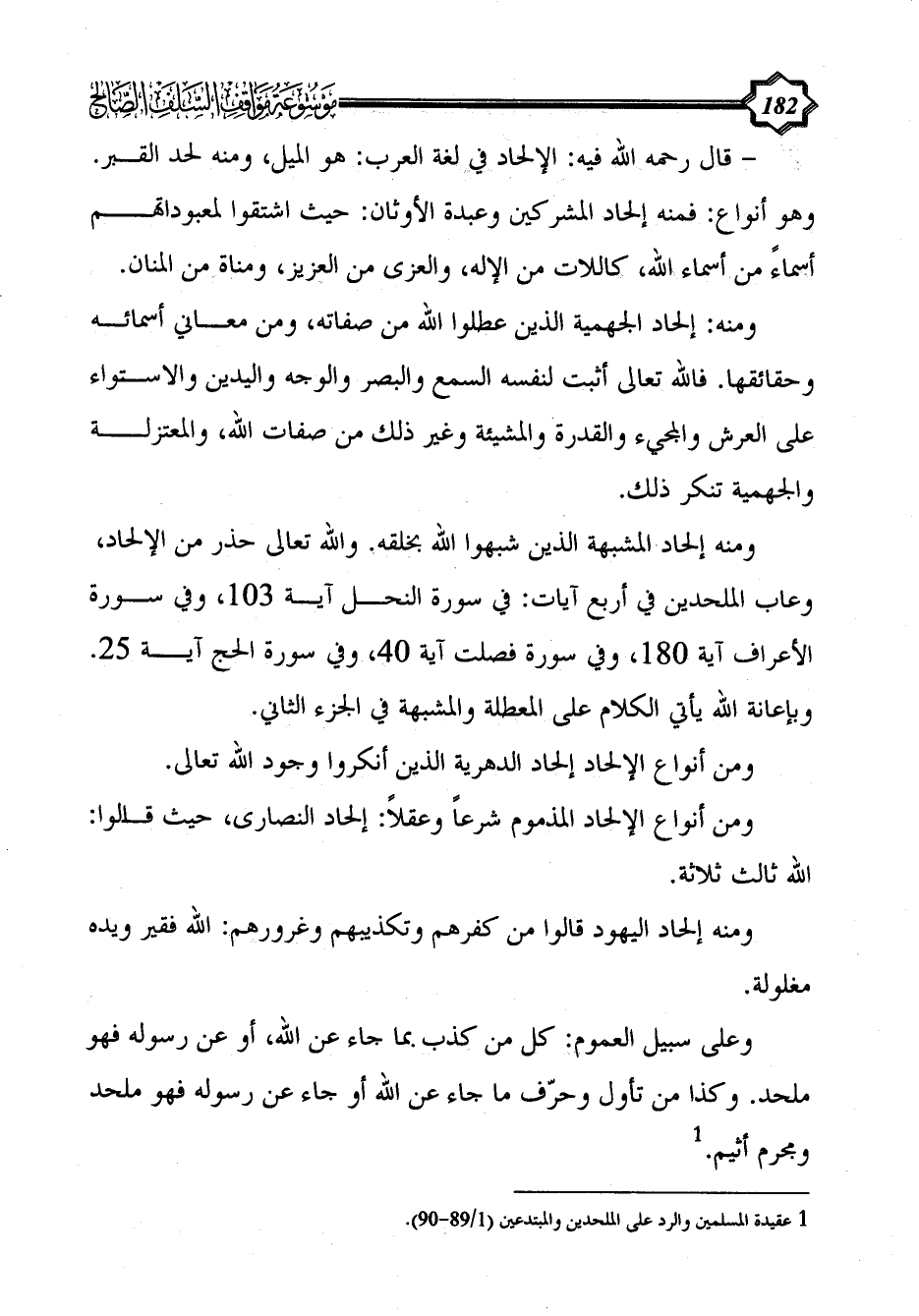 ومنه إلحاد المشبهة الذين شبهوا الله بخلقه. والله تعالى حذر من الإلحاد، وعاب الملحدين في أربع آيات: في سورة النحل آية 103، وفي سورة الأعراف آية 180، وفي سورة فصلت آية 40، وفي سورة الحج آية 25. وبإعانة الله يأتي الكلام على المعطلة والمشبهة في الجزء الثاني.