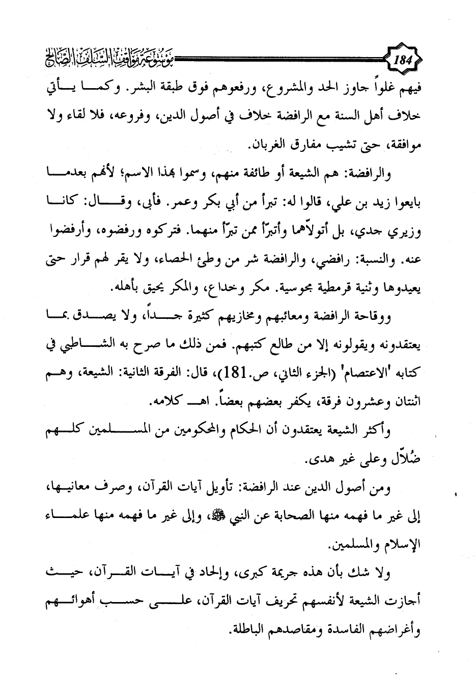 والرافضة: هم الشيعة أو طائفة منهم، وسموا بهذا الاسم؛ لأنهم بعدما بايعوا زيد بن علي، قالوا له: تبرأ من أبي بكر وعمر. فأبى، وقال: كانا وزيري جدي، بل أتولاّهما وأتبرّأ ممن تبرّأ منهما. فتركوه ورفضوه، وأرفضوا عنه. والنسبة: رافضي، والرافضة شر من وطئ الحصاء، ولا يقر لهم قرار حتى يعيدوها وثنية قرمطية مجوسية. مكر وخداع، والمكر يحيق بأهله.