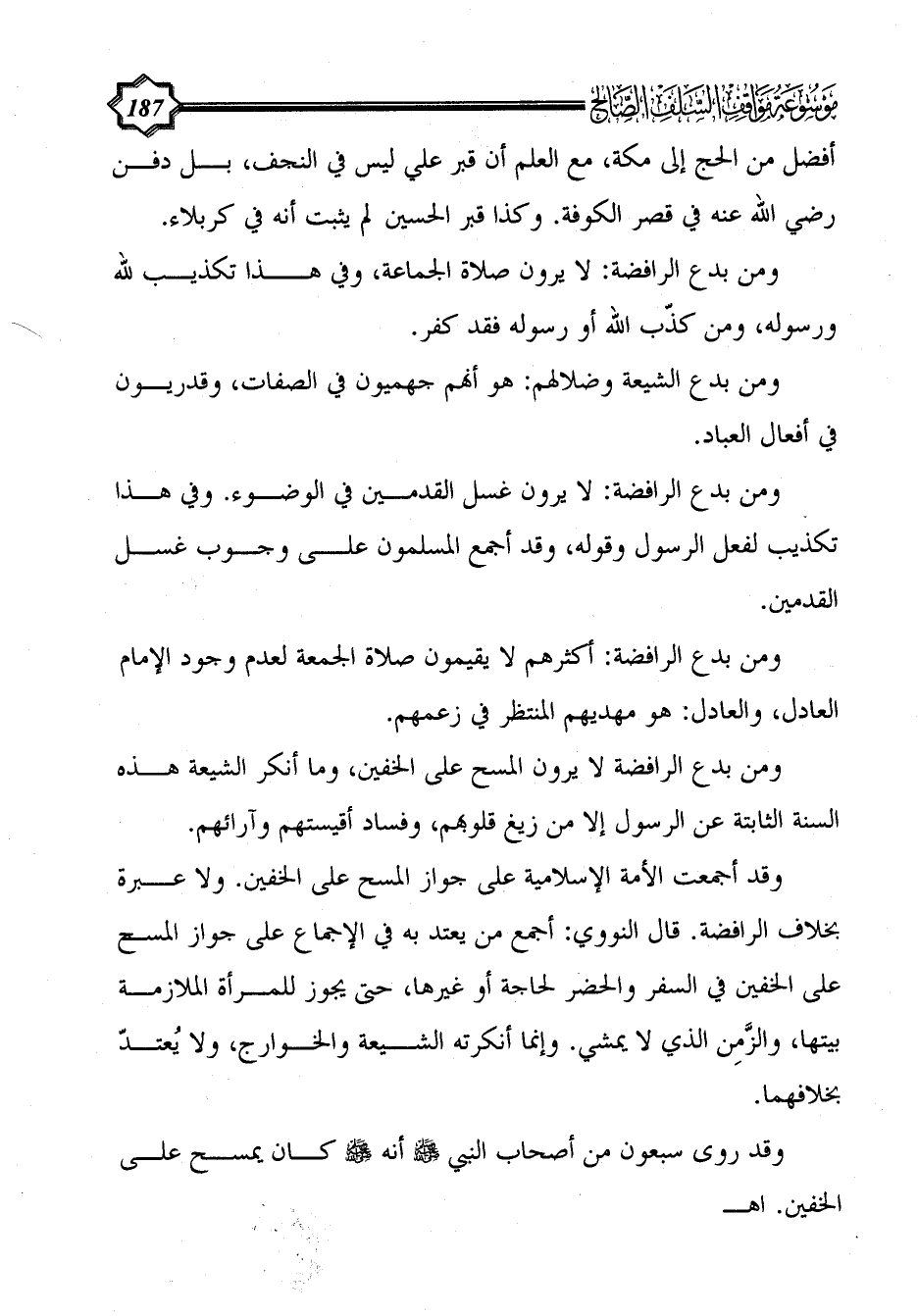 ومن بدع الرافضة لا يرون المسح على الخفين، وما أنكر الشيعة هذه السنة الثابتة عن الرسول إلا من زيغ قلوبهم، وفساد أقيستهم وآرائهم.