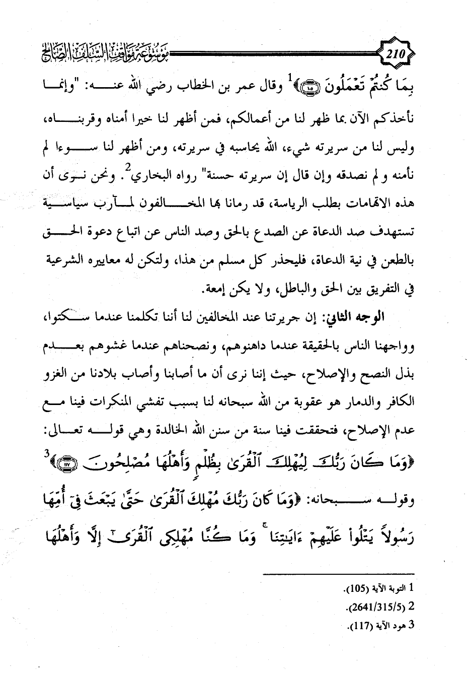الوجه الثاني: إن جريرتنا عند المخالفين لنا أننا تكلمنا عندما سكتوا، وواجهنا الناس بالحقيقة عندما داهنوهم، ونصحناهم عندما غشوهم بعدم بذل النصح والإصلاح، حيث إننا نرى أن ما أصابنا وأصاب بلادنا من الغزو الكافر والدمار هو عقوبة من الله سبحانه لنا بسبب تفشي المنكرات فينا مع عدم الإصلاح، فتحققت فينا سنة من سنن الله الخالدة وهي قوله تعالى: {وَمَا كَانَ رَبُّكَ لِيُهْلِكَ الْقُرَى بِظُلْمٍ وَأَهْلُهَا مُصْلِحُونَ (117)} (¬3) وقوله سبحانه: {وَمَا كَانَ رَبُّكَ مُهْلِكَ الْقُرَى حَتَّى يَبْعَثَ فِي أُمِّهَا رَسُولًا يَتْلُو عَلَيْهِمْ آَيَاتِنَا وَمَا كُنَّا مُهْلِكِي الْقُرَى إِلَّا وَأَهْلُهَا