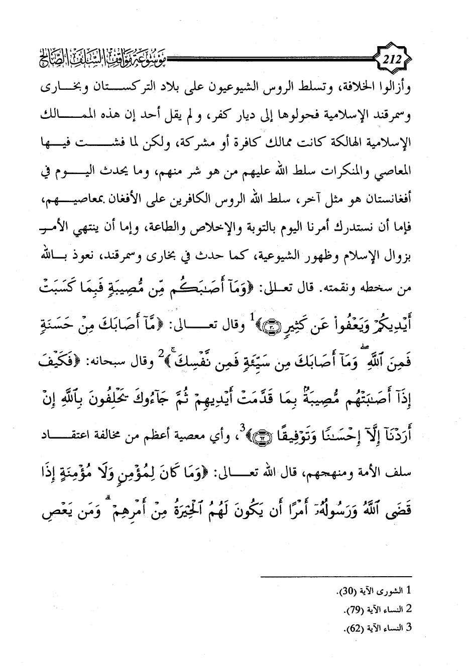 وأزالوا الخلافة، وتسلط الروس الشيوعيون على بلاد التركستان وبخارى وسمرقند الإسلامية فحولوها إلى ديار كفر، ولم يقل أحد إن هذه الممالك الإسلامية الهالكة كانت ممالك كافرة أو مشركة، ولكن لما فشت فيها المعاصي والمنكرات سلط الله عليهم من هو شر منهم، وما يحدث اليوم في أفغانستان هو مثل آخر، سلط الله الروس الكافرين على الأفغان بمعاصيهم، فإما أن نستدرك أمرنا اليوم بالتوبة والإخلاص والطاعة، وإما أن ينتهي الأمر بزوال الإسلام وظهور الشيوعية، كما حدث في بخارى وسمرقند، نعوذ بالله من سخطه ونقمته. قال تعالى: {وَمَا أَصَابَكُمْ مِنْ مُصِيبَةٍ فَبِمَا كَسَبَتْ أَيْدِيكُمْ وَيَعْفُو عَنْ كَثِيرٍ (30)} (¬1) وقال تعالى: {مَا أَصَابَكَ مِنْ حَسَنَةٍ فَمِنَ اللَّهِ وَمَا أَصَابَكَ مِنْ سَيِّئَةٍ فَمِنْ نَفْسِكَ} (¬2) وقال سبحانه: {فَكَيْفَ إِذَا أَصَابَتْهُمْ مُصِيبَةٌ بِمَا قَدَّمَتْ أَيْدِيهِمْ ثُمَّ جَاءُوكَ يَحْلِفُونَ بِاللَّهِ إِنْ أَرَدْنَا إِلَّا إِحْسَانًا وَتَوْفِيقًا (62)} (¬3)، وأي معصية أعظم من مخالفة اعتقاد سلف الأمة ومنهجهم، قال الله تعالى: {وَمَا كَانَ لِمُؤْمِنٍ وَلَا مُؤْمِنَةٍ إِذَا قَضَى اللَّهُ وَرَسُولُهُ أَمْرًا أَنْ يَكُونَ لَهُمُ الْخِيَرَةُ مِنْ أَمْرِهِمْ وَمَنْ يَعْصِ