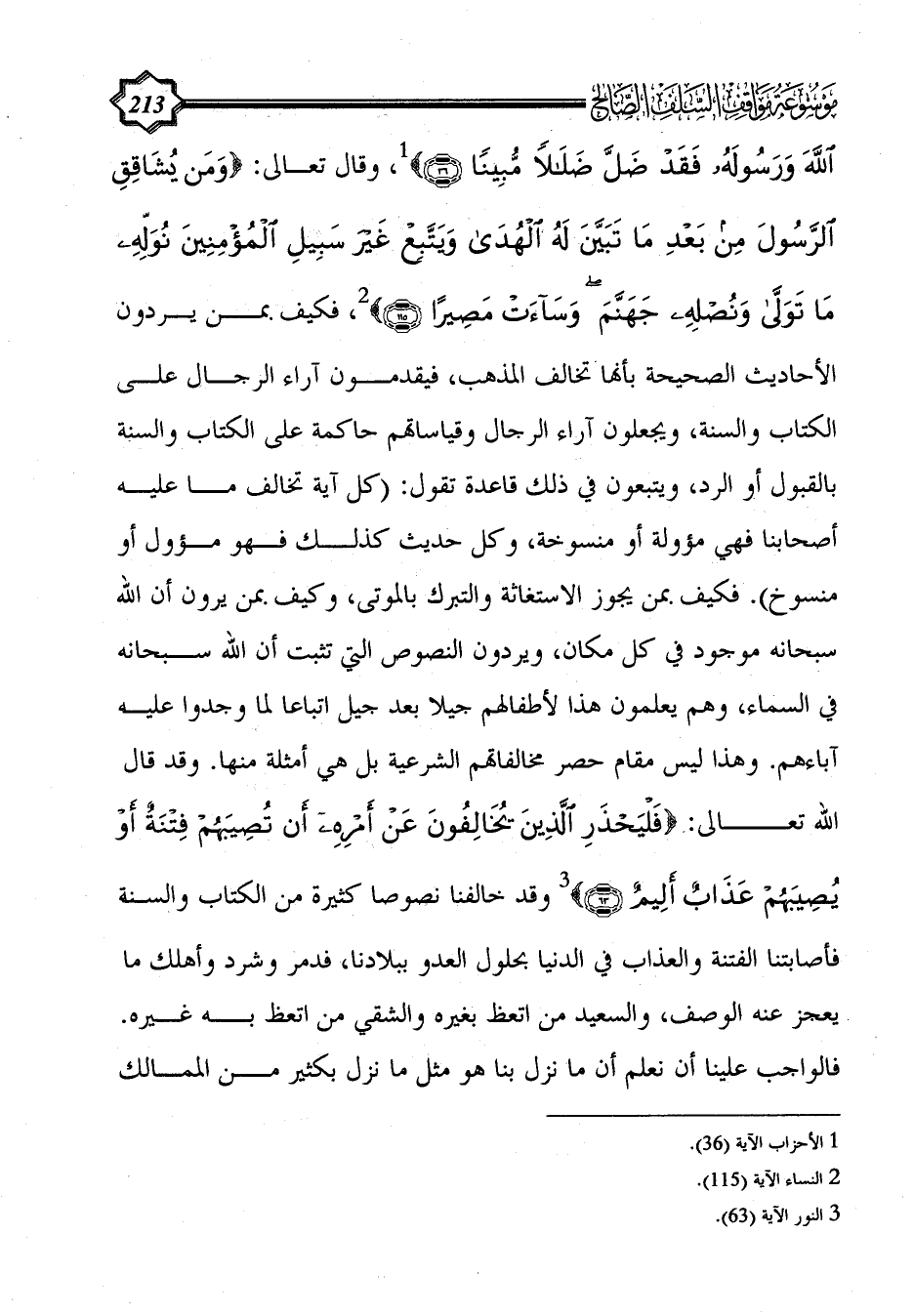 وقال تعالى: {وَمَنْ يُشَاقِقِ الرَّسُولَ مِنْ بَعْدِ مَا تَبَيَّنَ لَهُ الْهُدَى وَيَتَّبِعْ غَيْرَ سَبِيلِ الْمُؤْمِنِينَ نُوَلِّهِ مَا تَوَلَّى وَنُصْلِهِ جَهَنَّمَ وَسَاءَتْ مَصِيرًا (115)} (¬2)، فكيف بمن يردون الأحاديث الصحيحة بأنها تخالف المذهب، فيقدمون آراء الرجال على الكتاب والسنة، ويجعلون آراء الرجال وقياساتهم حاكمة على الكتاب والسنة بالقبول أو الرد، ويتبعون في ذلك قاعدة تقول: (كل آية تخالف ما عليه أصحابنا فهي مؤولة أو منسوخة، وكل حديث كذلك فهو مؤول أو منسوخ). فكيف بمن يجوز الاستغاثة والتبرك بالموتى، وكيف بمن يرون أن الله سبحانه موجود في كل مكان، ويردون النصوص التي تثبت أن الله سبحانه في السماء، وهم يعلمون هذا لأطفالهم جيلا بعد جيل اتباعا لما وجدوا عليه آباءهم. وهذا ليس مقام حصر مخالفاتهم الشرعية بل هي أمثلة منها. وقد قال الله تعالى: {فَلْيَحْذَرِ الَّذِينَ يُخَالِفُونَ عَنْ أَمْرِهِ أَنْ تُصِيبَهُمْ فِتْنَةٌ أَوْ يُصِيبَهُمْ عَذَابٌ أَلِيمٌ (63)} (¬3) وقد خالفنا نصوصا كثيرة من الكتاب والسنة فأصابتنا الفتنة والعذاب في الدنيا بحلول العدو ببلادنا، فدمر وشرد وأهلك ما يعجز عنه الوصف، والسعيد من اتعظ بغيره والشقي من اتعظ به غيره. فالواجب علينا أن نعلم أن ما نزل بنا هو مثل ما نزل بكثير من الممالك