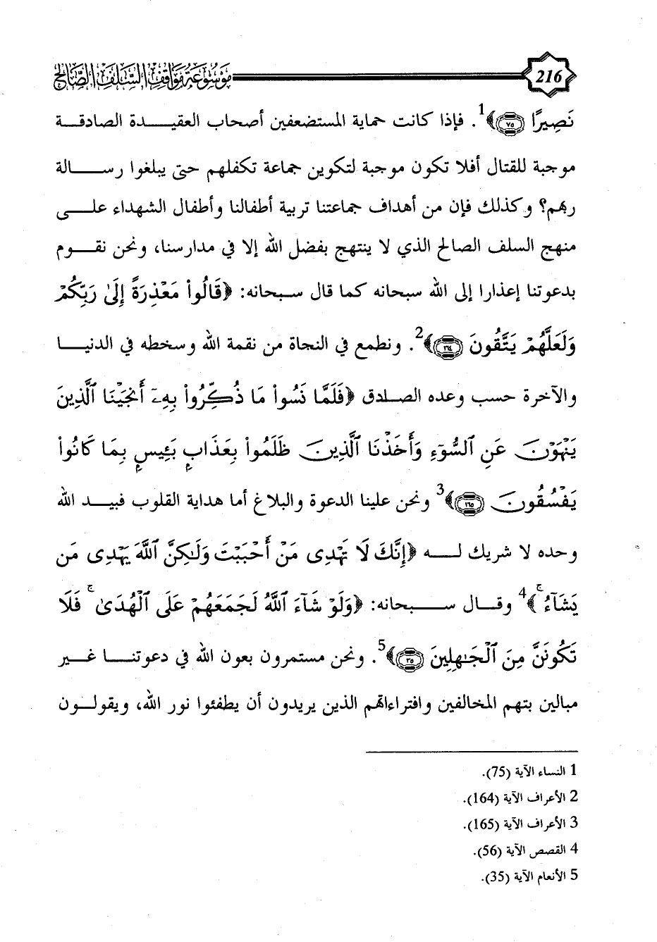 نَصِيرًا (75)} (¬1). فإذا كانت حماية المستضعفين أصحاب العقيدة الصادقة موجبة للقتال أفلا تكون موجبة لتكوين جماعة تكفلهم حتى يبلغوا رسالة ربهم؟ وكذلك فإن من أهداف جماعتنا تربية أطفالنا وأطفال الشهداء على منهج السلف الصالح الذي لا ينتهج بفضل الله إلا في مدارسنا، ونحن نقوم بدعوتنا إعذارا إلى الله سبحانه كما قال سبحانه: {قَالُوا مَعْذِرَةً إِلَى رَبِّكُمْ وَلَعَلَّهُمْ يَتَّقُونَ (164)} (¬2). ونطمع في النجاة من نقمة الله وسخطه في الدنيا والآخرة حسب وعده الصادق {فَلَمَّا نَسُوا مَا ذُكِّرُوا بِهِ أَنْجَيْنَا الَّذِينَ يَنْهَوْنَ عَنِ السُّوءِ وَأَخَذْنَا الَّذِينَ ظَلَمُوا بِعَذَابٍ بَئِيسٍ بِمَا كَانُوا يَفْسُقُونَ (165)} (¬3) ونحن علينا الدعوة والبلاغ أما هداية القلوب فبيد الله وحده لا شريك له {إِنَّكَ لَا تَهْدِي مَنْ أَحْبَبْتَ وَلَكِنَّ اللَّهَ يَهْدِي مَنْ يَشَاءُ} (¬4) وقال سبحانه: {وَلَوْ شَاءَ اللَّهُ لَجَمَعَهُمْ عَلَى الْهُدَى فَلَا تَكُونَنَّ مِنَ الْجَاهِلِينَ (35)} (¬5). ونحن مستمرون بعون الله في دعوتنا غير مبالين بتهم المخالفين وافتراءاتهم الذين يريدون أن يطفئوا نور الله، ويقولون