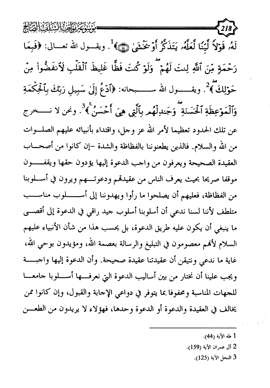 لَهُ قَوْلًا لَيِّنًا لَعَلَّهُ يَتَذَكَّرُ أَوْ يَخْشَى (44)} (¬1). ويقول الله تعالى: {فَبِمَا رَحْمَةٍ مِنَ اللَّهِ لِنْتَ لَهُمْ وَلَوْ كُنْتَ فَظًّا غَلِيظَ الْقَلْبِ لَانْفَضُّوا مِنْ حَوْلِكَ} (¬2). ويقول الله سبحانه: {ادْعُ إِلَى سَبِيلِ رَبِّكَ بِالْحِكْمَةِ وَالْمَوْعِظَةِ الْحَسَنَةِ وَجَادِلْهُمْ بِالَّتِي هِيَ أَحْسَنُ} (¬3). ونحن لا نخرج عن تلك الحدود تعظيما لأمر الله عز وجل، واقتداء بأنبيائه عليهم الصلوات من الله والسلام. فالذين يطعنوننا بالفظاظة والشدة -إن كانوا من أصحاب العقيدة الصحيحة ويعرفون من واجب الدعوة إليها يؤدون حقها ويقفون موقفا صريحا بحيث يعرف الناس من عقيدتهم ودعوتهم ويرون في أسلوبنا من الفظاظة، فعليهم أن يصلحوا ما رأوا ويهدوننا إلى أسلوب مناسب متلطف لأننا لسنا ندعي أن أسلوبنا أسلوب جيد راقي في الدعوة إلى أقصى ما ينبغي أن يكون عليه طريق الدعوة، بل يحسب هذا من شأن الأنبياء عليهم السلام لأنهم معصومون في التبليغ والرسالة بعصمة الله، ومؤيدون بوحي الله، غاية ما ندعي ونتيقن أن عقيدتنا عقيدة صحيحة. وأن الدعوة إليها واجبة ويجب علينا أن نختار من بين أساليب الدعوة التي نعرفها أسلوبا جامعا للجهات المناسبة ومحفوفا بما يتوفر في دواعي الإجابة والقبول، وإن كانوا ممن يخالف في العقيدة والدعوة أو الدعوة وحدها، فهؤلاء لا يريدون من الطعن
