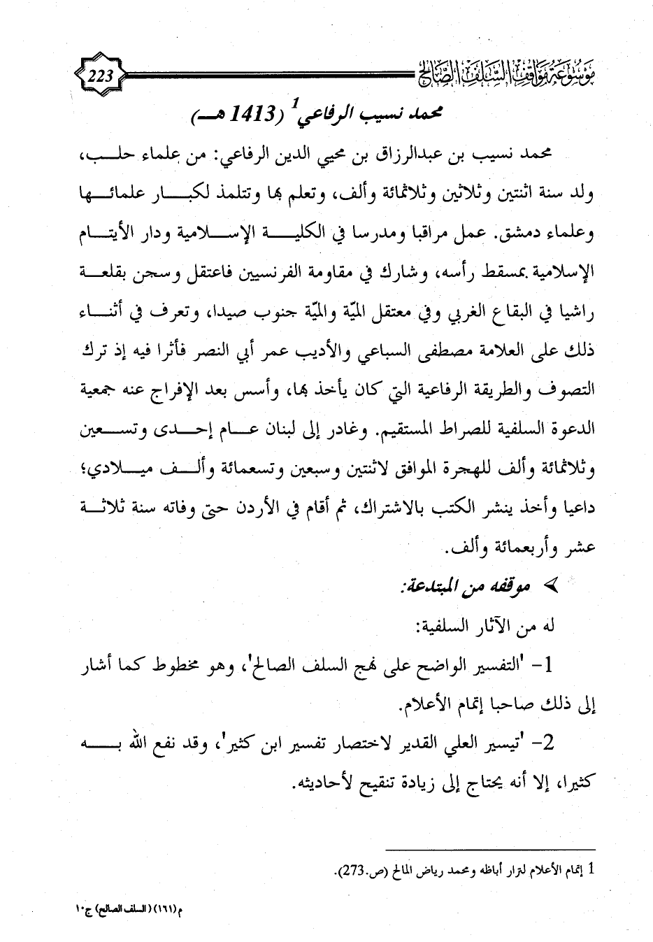 محمد نسيب بن عبد الرزاق بن محيي الدين الرفاعي: من علماء حلب، ولد سنة اثنتين وثلاثين وثلاثمائة وألف، وتعلم بها وتتلمذ لكبار علمائها وعلماء دمشق. عمل مراقبا ومدرسا في الكلية الإسلامية ودار الأيتام الإسلامية بمسقط رأسه، وشارك في مقاومة الفرنسيين فاعتقل وسجن بقلعة راشيا في البقاع الغربي وفي معتقل الميّة والميّة جنوب صيدا، وتعرف في أثناء ذلك على العلامة مصطفى السباعي والأديب عمر أبي النصر فأثرا فيه إذ ترك التصوف والطريقة الرفاعية التي كان يأخذ بها، وأسس بعد الإفراج عنه جمعية الدعوة السلفية للصراط المستقيم. وغادر إلى لبنان عام إحدى وتسعين وثلاثمائة وألف للهجرة الموافق لاثنتين وسبعين وتسعمائة وألف ميلادي؛ داعيا وأخذ ينشر الكتب بالاشتراك، ثم أقام في الأردن حتى وفاته سنة ثلاثة عشر وأربعمائة وألف.
