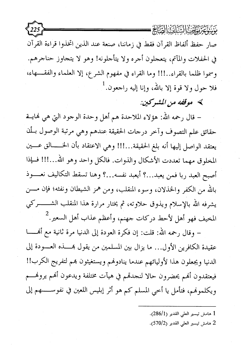 - قال رحمه الله: هؤلاء الملاحدة هم أهل وحدة الوجود التي هي نهاية حقائق علم التصوف وآخر درجات الحقيقة عندهم وهي مرتبة الوصول بأن يعتقد الواصل إليها أنه بلغ الحقيقة ... !!! وهي الاعتقاد بأن الخالق عين المخلوق مهما تعددت الأشكال والذوات. فالكل واحد وهو الله ... !!! فإذا أصبح العبد ربا فمن يعبد ... ؟ أيعبد نفسه ... ؟ وهنا تسقط التكاليف نعوذ بالله من الكفر والخذلان، وسوء المنقلب، ومن همز الشيطان ونفثه؛ فإن من يشرفه الله بالإسلام ويذوق حلاوته، ثم يختار مرارة هذا المنقلب الشركي المخيف فهو أهل لأحط دركات جهنم، وأعظم عذاب أهل السعير. (¬2)