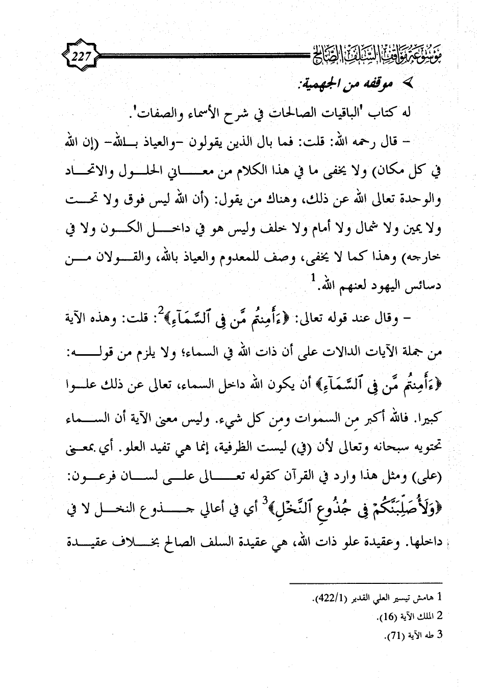 - وقال عند قوله تعالى: {أَأَمِنْتُمْ مَنْ فِي السَّمَاءِ} (¬2): قلت: وهذه الآية من جملة الآيات الدالات على أن ذات الله في السماء؛ ولا يلزم من قوله: {أَأَمِنْتُمْ مَنْ فِي السَّمَاءِ} أن يكون الله داخل السماء، تعالى عن ذلك علوا كبيرا. فالله أكبر مِن السموات ومِن كل شيء. وليس معنى الآية أن السماء تحتويه سبحانه وتعالى لأن (في) ليست الظرفية، إنما هي تفيد العلو. أي بمعنى (على) ومثل هذا وارد في القرآن كقوله تعالى على لسان فرعون: {وَلَأُصَلِّبَنَّكُمْ فِي جُذُوعِ النَّخْلِ} (¬3) أي في أعالي جذوع النخل لا في داخلها. وعقيدة علو ذات الله، هي عقيدة السلف الصالح بخلاف عقيدة
