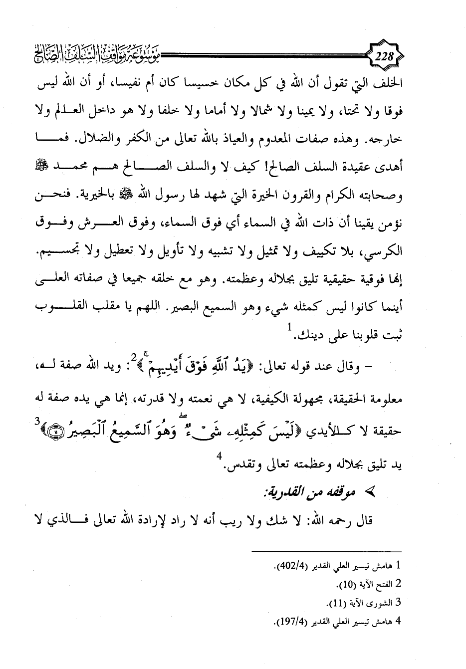 - وقال عند قوله تعالى: {يَدُ اللَّهِ فَوْقَ أَيْدِيهِمْ} (¬2): ويد الله صفة له، معلومة الحقيقة، مجهولة الكيفية، لا هي نعمته ولا قدرته، إنما هي يده صفة له حقيقة لا كالأيدي {لَيْسَ كَمِثْلِهِ شَيْءٌ وَهُوَ السَّمِيعُ الْبَصِيرُ (11)} (¬3) يد تليق بجلاله وعظمته تعالى وتقدس. (¬4)