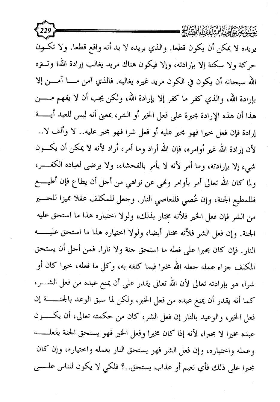 يريده لا يمكن أن يكون قطعا. والذي يريده لا بد أنه واقع قطعا. ولا تكون حركة ولا سكنة إلا بإرادته، وإلا فيكون هناك مريد يغالب إرادة الله؛ وتنزه الله سبحانه أن يكون في الكون مريد غيره يغالبه. فالذي آمن ما آمن إلا بإرادة الله، والذي كفر ما كفر إلا بإرادة الله، ولكن يجب أن لا يفهم من هذا أن هذه الإرادة مجبرة على فعل الخير أو الشر، بمعنى أنه ليس للعبد أية إرادة فإن فعل خيرا فهو مجبر عليه أو فعل شرا فهو مجبر عليه .. لا وألف لا .. لأن إرادة الله غير أوامره، فإن الله أراد وما أمر، أراد لأنه لا يمكن أن يكون شيء إلا بإرادته، وما أمر لأنه لا يأمر بالفحشاء، ولا يرضى لعباده الكفر، ولما كان الله تعالى أمر بأوامر ونهى عن نواهي من أجل أن يطاع فإن أطيع فللمطيع الجنة، وإن عُصي فللعاصي النار. وجعل للمكلف عقلا مميزا للخير من الشر فإن فعل الخير فلأنه مختار بذلك، ولولا اختياره هذا ما استحق عليه الجنة. وإن فعل الشر فلأنه مختار أيضا، ولولا اختياره هذا ما استحق عليه النار. فإن كان مجبرا على فعله ما استحق جنة ولا نارا. فمن أجل أن يستحق المكلف جزاء عمله جعله الله مخيرا فيما كلفه به، وكل ما فعله، خيرا كان أو شرا، هو بإرادته تعالى لأن الله تعالى يقدر على أن يمنع عبده من فعل الشر، كما أنه يقدر أن يمنع عبده من فعل الخير، ولكن لما سبق الوعد بالجنة إن فعل الخير، والوعيد بالنار إن فعل الشر، كان من حكمته تعالى، أن يكون عبده مخيرا لا مجبرا، لأنه إذا كان مخيرا وفعل الخير فهو يستحق الجنة بفعله وعمله واختياره، وإن فعل الشر فهو يستحق النار بعمله واختياره، وإن كان مجبرا على ذلك فأي نعيم أو عذاب يستحق .. ؟