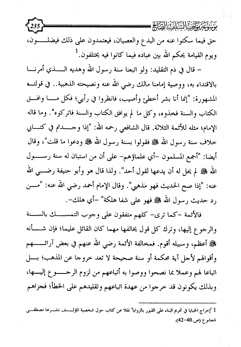 - قال في ذم التقليد: ولو اتبعنا سنة رسول الله وهديه الذي أمرنا بالاقتداء به، ووصية إمامنا مالك رضي الله عنه ونصيحته الذهبية .. في قولته المشهورة: "إنما أنا بشر أخطئ وأصيب، فانظروا في رأيي؛ فكل ما وافق الكتاب والسنة فخذوه، وكل ما لم يوافق الكتاب والسنة فاتركوه". وما قاله الإمام؛ مثله للأئمة الثلاثة. قال الشافعي رحمه الله: "إذا وجدتم في كتابي خلاف سنة رسول الله - صلى الله عليه وسلم - فقولوا بسنة رسول الله - صلى الله عليه وسلم - ودعوا ما قلت"، وقال أيضا: "أجمع المسلمون -أي علماؤهم- على أن من استبان له سنة رسول الله - صلى الله عليه وسلم - لم يحل له أن يدعها لقول أحد". ولذا قال هو وأبو حنيفة رضي الله عنه: "إذا صح الحديث فهو مذهبي". وقال الإمام أحمد رضي الله عنه: "من رد حديث رسول الله - صلى الله عليه وسلم - فهو على شفا هلكة" -أي هلك-.