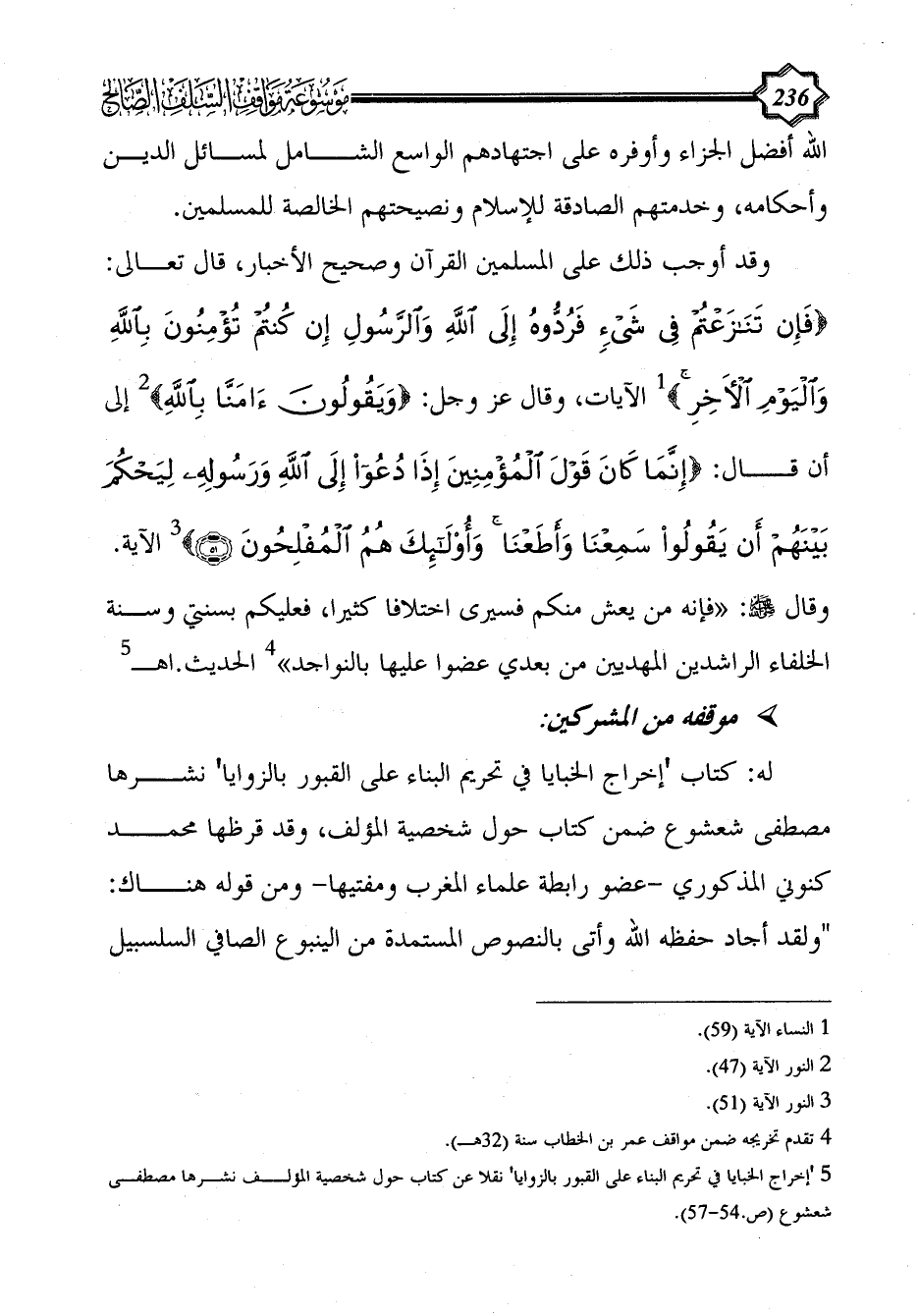 وقد أوجب ذلك على المسلمين القرآن وصحيح الأخبار، قال تعالى: {فَإِنْ تَنَازَعْتُمْ فِي شَيْءٍ فَرُدُّوهُ إِلَى اللَّهِ وَالرَّسُولِ إِنْ كُنْتُمْ تُؤْمِنُونَ بِاللَّهِ وَالْيَوْمِ الْآَخِرِ} (¬1) الآيات، وقال عز وجل: {وَيَقُولُونَ آَمَنَّا بِاللَّهِ} (¬2) إلى أن قال: {إِنَّمَا كَانَ قَوْلَ الْمُؤْمِنِينَ إِذَا دُعُوا إِلَى اللَّهِ وَرَسُولِهِ لِيَحْكُمَ بَيْنَهُمْ أَنْ يَقُولُوا سَمِعْنَا وَأَطَعْنَا وَأُولَئِكَ هُمُ الْمُفْلِحُونَ (51)} (¬3) الآية. وقال - صلى الله عليه وسلم -: «فإنه من يعش منكم فسيرى اختلافا كثيرا، فعليكم بسنتي وسنة الخلفاء الراشدين المهديين من بعدي عضوا عليها بالنواجد» (¬4) الحديث. اهـ (¬5)