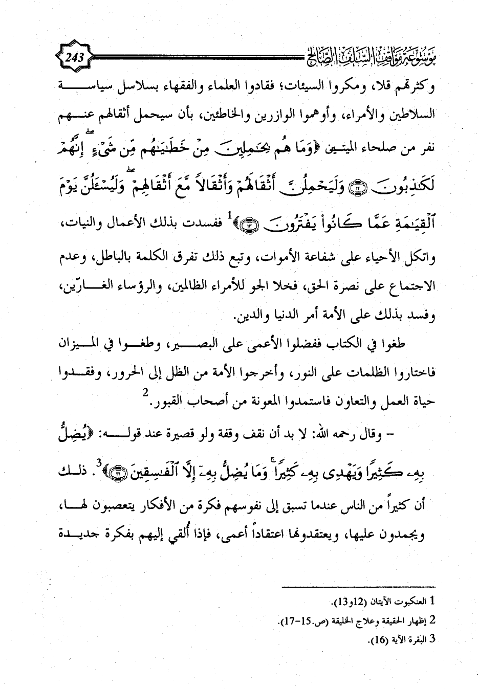 وكثرتهم قلا، ومكروا السيئات؛ فقادوا العلماء والفقهاء بسلاسل سياسة السلاطين والأمراء، وأوهموا الوازرين والخاطئين، بأن سيحمل أثقالهم عنهم نفر من صلحاء الميتين {وَمَا هُمْ بِحَامِلِينَ مِنْ خَطَايَاهُمْ مِنْ شَيْءٍ إِنَّهُمْ لَكَاذِبُونَ (12) وَلَيَحْمِلُنَّ أَثْقَالَهُمْ وَأَثْقَالًا مَعَ أَثْقَالِهِمْ وَلَيُسْأَلُنَّ يَوْمَ الْقِيَامَةِ عَمَّا كَانُوا يَفْتَرُونَ (13)} (¬1) ففسدت بذلك الأعمال والنيات، واتكل الأحياء على شفاعة الأموات، وتبع ذلك تفرق الكلمة بالباطل، وعدم الاجتماع على نصرة الحق، فخلا الجو للأمراء الظالمين، والرؤساء الغارّين، وفسد بذلك على الأمة أمر الدنيا والدين.