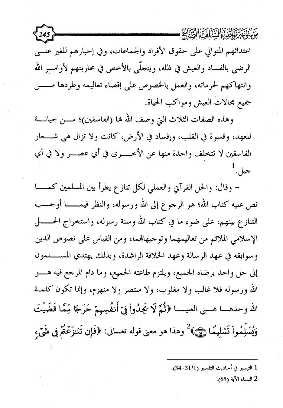 - وقال: والحل القرآني والعملي لكل تنازع يطرأ بين المسلمين كما نص عليه كتاب الله؛ هو الرجوع إلى الله ورسوله، والنظر فيما أوجب التنازع بينهم، على ضوء ما في كتاب الله وسنة رسوله، واستخراج الحل الإسلامي الملائم من تعاليمهما وتوجيهاتهما، ومن القياس على نصوص الدين وسوابقه في عهد الرسالة وعهد الخلافة الراشدة، وبذلك يهتدي المسلمون إلى حل واحد يرضاه الجميع، ويلتزم طاعته الجميع، وما دام المرجع فيه هو الله ورسوله فلا غالب ولا مغلوب، ولا منتصر ولا منهزم، وإنما تكون كلمة الله وحدها هي العليا {ثُمَّ لَا يَجِدُوا فِي أَنْفُسِهِمْ حَرَجًا مِمَّا قَضَيْتَ وَيُسَلِّمُوا تَسْلِيمًا (65)} (¬2) وهذا هو معنى قوله تعالى: {فَإِنْ تَنَازَعْتُمْ فِي شَيْءٍ