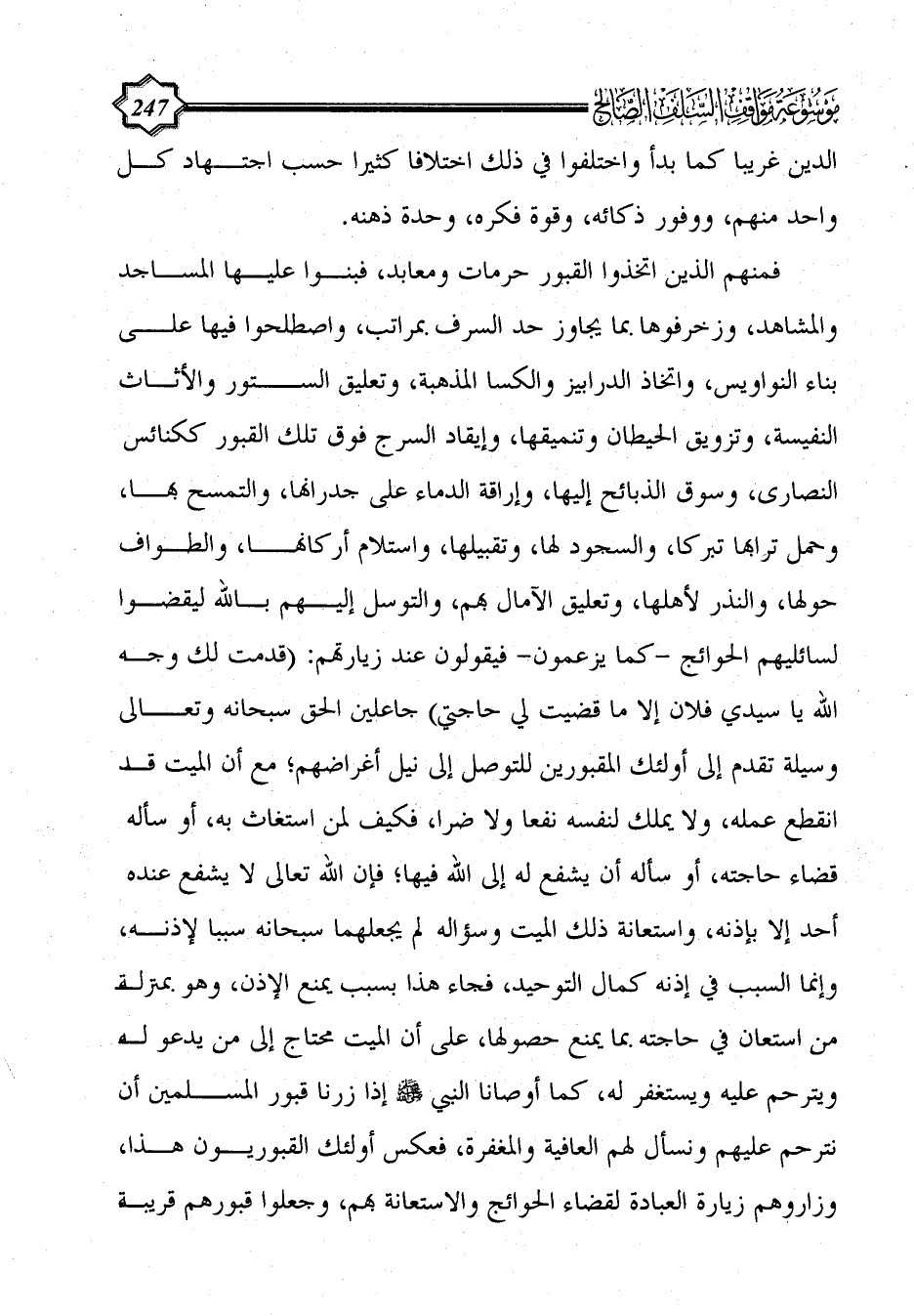 فمنهم الذين اتخذوا القبور حرمات ومعابد، فبنوا عليها المساجد والمشاهد، وزخرفوها بما يجاوز حد السرف بمراتب، واصطلحوا فيها على بناء النواويس، واتخاذ الدرابيز والكسا المذهبة، وتعليق الستور والأثاث النفيسة، وتزويق الحيطان وتنميقها، وإيقاد السرج فوق تلك القبور ككنائس النصارى، وسوق الذبائح إليها، وإراقة الدماء على جدرانها، والتمسح بها، وحمل ترابها تبركا، والسجود لها، وتقبيلها، واستلام أركانها، والطواف حولها، والنذر لأهلها، وتعليق الآمال بهم، والتوسل إليهم بالله ليقضوا لسائليهم الحوائج -كما يزعمون- فيقولون عند زيارتهم: (قدمت لك وجه الله يا سيدي فلان إلا ما قضيت لي حاجتي) جاعلين الحق سبحانه وتعالى وسيلة تقدم إلى أولئك المقبورين للتوصل إلى نيل أغراضهم؛ مع أن الميت قد انقطع عمله، ولا يملك لنفسه نفعا ولا ضرا، فكيف لمن استغاث به، أو سأله قضاء حاجته، أو سأله أن يشفع له إلى الله فيها؛ فإن الله تعالى لا يشفع عنده أحد إلا بإذنه، واستعانة ذلك الميت وسؤاله لم يجعلهما سبحانه سببا لإذنه، وإنما السبب في إذنه كمال التوحيد، فجاء هذا بسبب يمنع الإذن، وهو بمنزلة من استعان في حاجته بما يمنع حصولها، على أن الميت محتاج إلى من يدعو له ويترحم عليه ويستغفر له، كما أوصانا النبي - صلى الله عليه وسلم - إذا زرنا قبور المسلمين أن نترحم عليهم ونسأل لهم العافية والمغفرة، فعكس أولئك القبوريون هذا، وزاروهم زيارة العبادة لقضاء الحوائج والاستعانة بهم، وجعلوا قبورهم قريبة