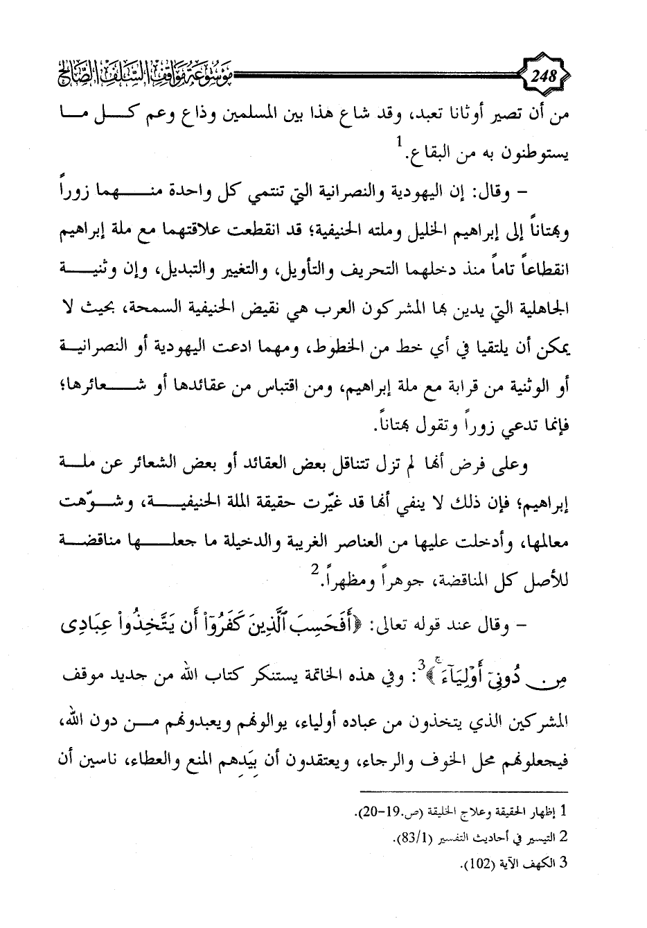 - وقال: إن اليهودية والنصرانية التي تنتمي كل واحدة منهما زوراً وبهتاناً إلى إبراهيم الخليل وملته الحنيفية؛ قد انقطعت علاقتهما مع ملة إبراهيم انقطاعاً تاماً منذ دخلهما التحريف والتأويل، والتغيير والتبديل، وإن وثنية الجاهلية التي يدين بها المشركون العرب هي نقيض الحنيفية السمحة، بحيث لا يمكن أن يلتقيا في أي خط من الخطوط، ومهما ادعت اليهودية أو النصرانية أو الوثنية من قرابة مع ملة إبراهيم، ومن اقتباس من عقائدها أو شعائرها؛ فإنما تدعي زوراً وتقول بهتاناً.