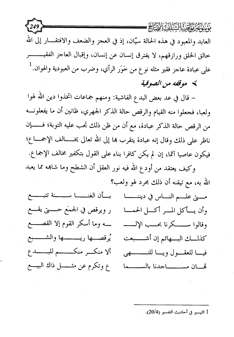 - قال في عد بعض البدع الفاشية: ومنهم جماعات اتخذوا دين الله لهوا ولعبا، فجعلوا منه القيام والرقص حالة الذكر الجهري، ظانين أن ما يفعلونه من الرقص حالة الذكر عبادة، مع أن من ظن ذلك تجب عليه التوبة؛ فإن ناظر على ذلك وقال إنه عبادة يتقرب بها إلى الله تعالى يخالف الإجماع؛ فيكون عاصيا آثما، إن لم يكن كافرا بناء على القول بتكفير مخالف الإجماع.