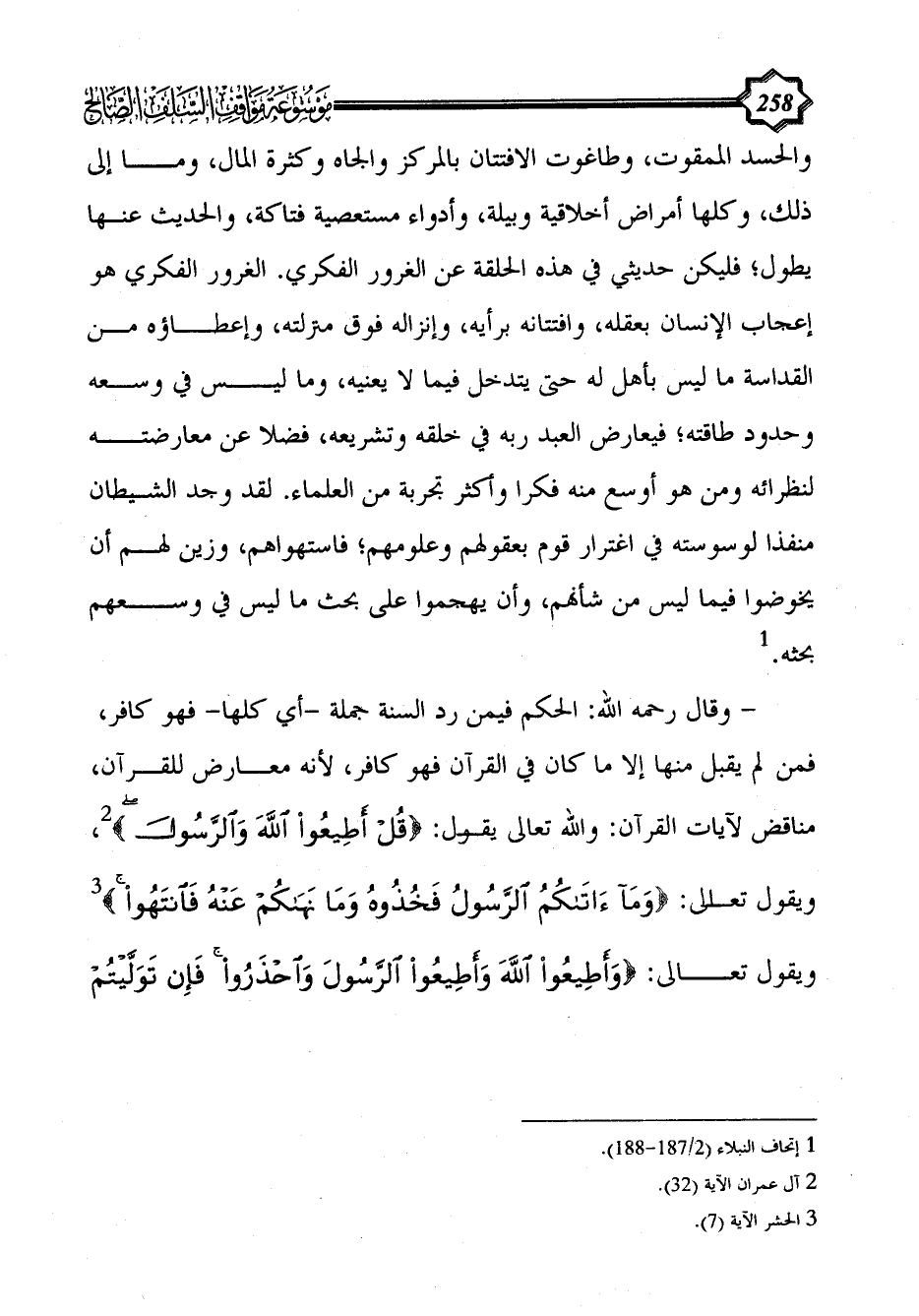 - وقال رحمه الله: الحكم فيمن رد السنة جملة -أي كلها- فهو كافر، فمن لم يقبل منها إلا ما كان في القرآن فهو كافر، لأنه معارض للقرآن، مناقض لآيات القرآن: والله تعالى يقول: {قُلْ أَطِيعُوا اللَّهَ وَالرَّسُولَ} (¬2)، ويقول تعالى: {وَمَا آَتَاكُمُ الرَّسُولُ فَخُذُوهُ وَمَا نَهَاكُمْ عَنْهُ فَانْتَهُوا} (¬3) ويقول تعالى: {وَأَطِيعُوا اللَّهَ وَأَطِيعُوا الرَّسُولَ وَاحْذَرُوا فَإِنْ تَوَلَّيْتُمْ