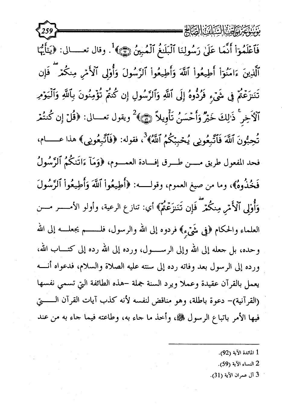 فقوله: {فاتبعوني} هذا عام، فحد المفعول طريق من طرق إفادة العموم، {وَمَا آَتَاكُمُ الرَّسُولُ فَخُذُوهُ}، وما من صيغ العموم، وقوله: {أَطِيعُوا اللَّهَ وَأَطِيعُوا الرَّسُولَ وَأُولِي الْأَمْرِ مِنْكُمْ فَإِنْ تَنَازَعْتُمْ} أي: تنازع الرعية، وأولو الأمر من العلماء والحكام {فِي شَيْءٍ} فردوه إلى الله والرسول، فلم يجعله إلى الله وحده، بل جعله إلى الله وإلى الرسول، ورده إلى الله رده إلى كتاب الله، ورده إلى الرسول بعد وفاته رده إلى سنته عليه الصلاة والسلام، فدعواه أنه يعمل بالقرآن عقيدة وعملا ويرد السنة جملة -هذه الطائفة التي تسمي نفسها (القرآنية) - دعوة باطلة، وهو مناقض لنفسه لأنه كذب آيات القرآن التي فيها الأمر باتباع الرسول - صلى الله عليه وسلم -، وأخذ ما جاء به، وطاعته فيما جاء به من عند