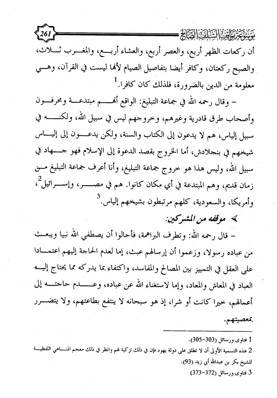 - وقال رحمه الله في جماعة التبليغ: الواقع أنهم مبتدعة ومحرفون وأصحاب طرق قادرية وغيرهم، وخروجهم ليس في سبيل الله، ولكنه في سبيل إلياس، هم لا يدعون إلى الكتاب والسنة، ولكن يدعون إلى إلياس شيخهم في بنجلادش، أما الخروج بقصد الدعوة إلى الإسلام فهو جهاد في سبيل الله، وليس هذا هو خروج جماعة التبليغ، وأنا أعرف جماعة التبليغ من زمان قديم، وهم المبتدعة في أي مكان كانوا. هم في مصر، وإسرائيل (¬2)، وأمريكا، والسعودية، كلهم مرتبطون بشيخهم إلياس. (¬3)