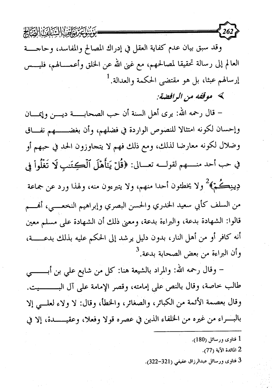 - قال رحمه الله: يرى أهل السنة أن حب الصحابة دين وإيمان وإحسان لكونه امتثالا للنصوص الواردة في فضلهم، وأن بغضهم نفاق وضلال لكونه معارضا لذلك، ومع ذلك فهم لا يتجاوزون الحد في حبهم أو في حب أحد منهم لقوله تعالى: {قُلْ يَا أَهْلَ الْكِتَابِ لَا تَغْلُوا فِي دِينِكُمْ} (¬2) ولا يخطئون أحدا منهم، ولا يتبرءون منه، ولهذا ورد عن جماعة من السلف كأبي سعيد الخدري والحسن البصري وإبراهيم النخعي، أنهم قالوا: الشهادة بدعة، والبراءة بدعة، ومعنى ذلك أن الشهادة على مسلم معين أنه كافر أو من أهل النار، بدون دليل يرشد إلى الحكم عليه بذلك بدعة، وأن البراءة من بعض الصحابة بدعة. (¬3)