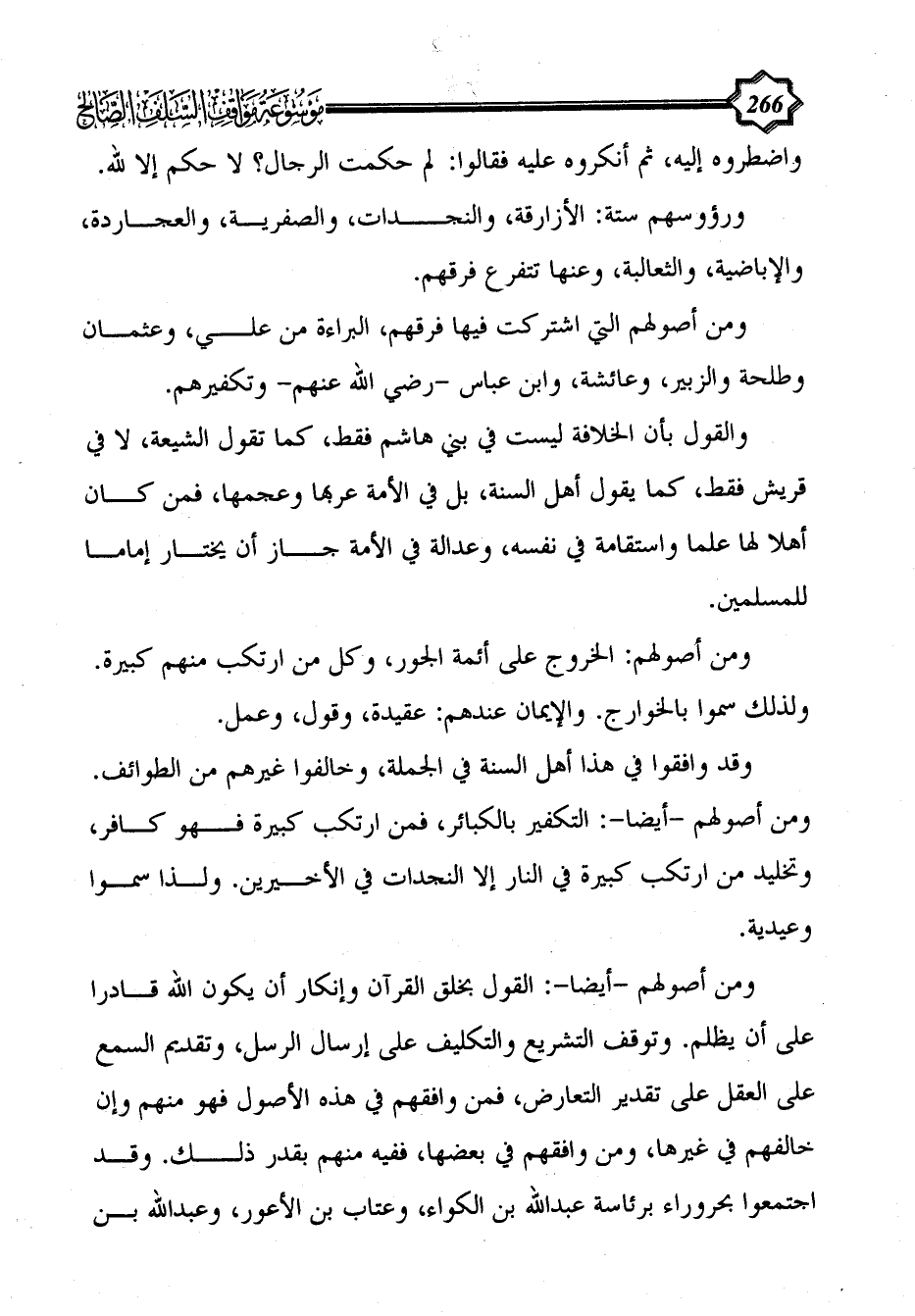 ومن أصولهم -أيضا-: القول بخلق القرآن وإنكار أن يكون الله قادرا على أن يظلم. وتوقف التشريع والتكليف على إرسال الرسل، وتقديم السمع على العقل على تقدير التعارض، فمن وافقهم في هذه الأصول فهو منهم وإن خالفهم في غيرها، ومن وافقهم في بعضها، ففيه منهم بقدر ذلك. وقد اجتمعوا بحروراء برئاسة عبد الله بن الكواء، وعتاب بن الأعور، وعبد الله بن