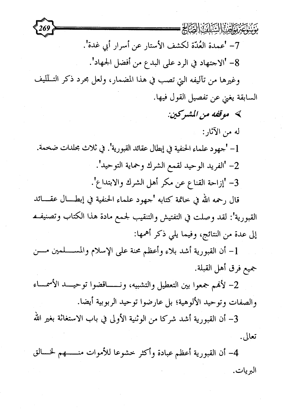 قال رحمه الله في خاتمة كتابه 'جهود علماء الحنفية في إبطال عقائد القبورية': لقد وصلت في التفتيش والتنقيب لجمع مادة هذا الكتاب وتصنيفه إلى عدة من النتائج، وفيما يلي ذكر أهمها: